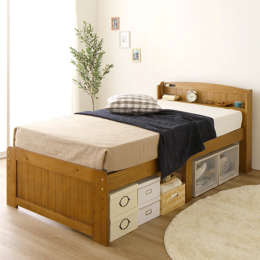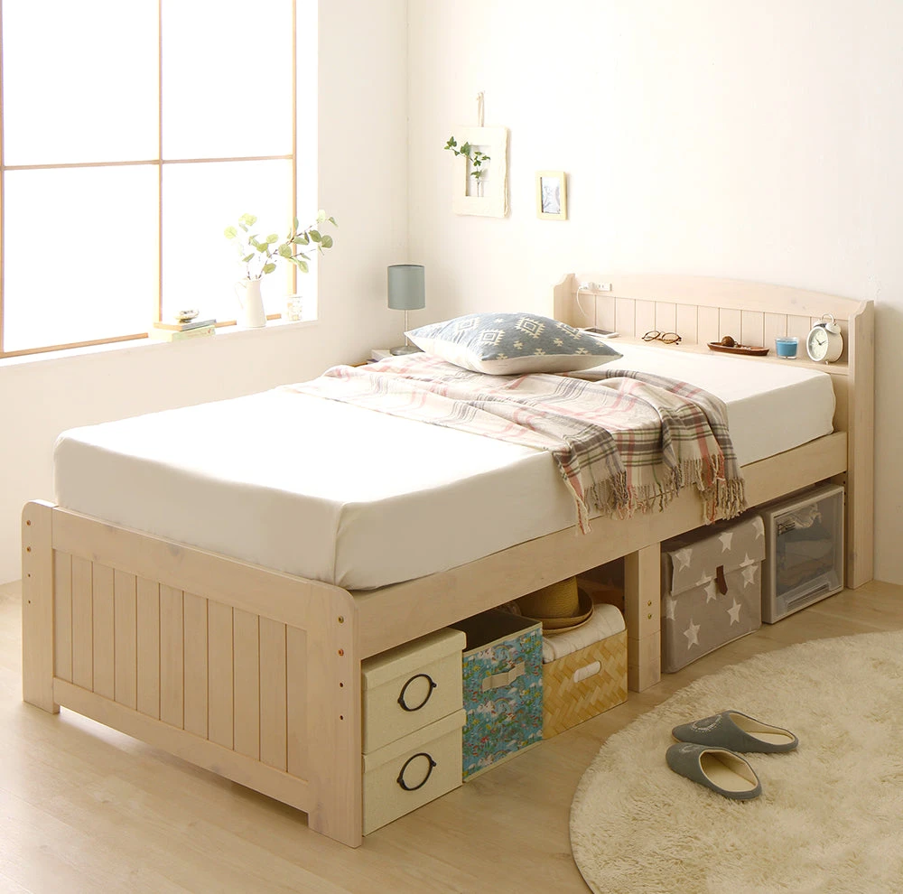 引き出しと高さ調整で床下収納のカントリー調棚付きベッド セミシングル(ショート丈) ミドルタイプ[床下20~32cm] ナチュラル ポケットコイルマットレス付き