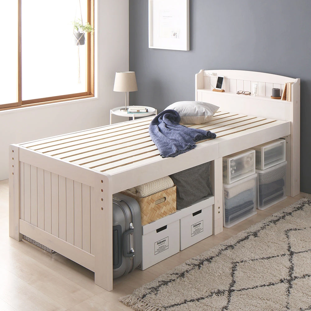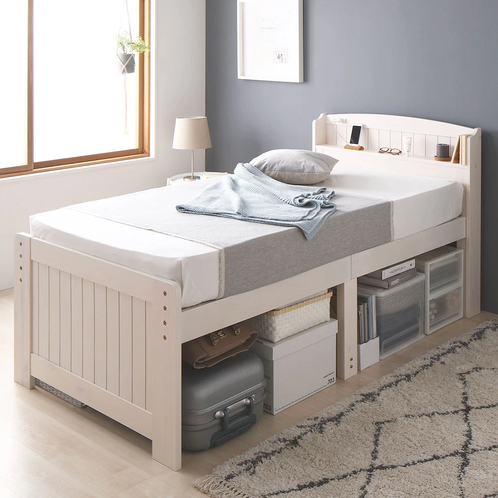 引き出しと高さ調整で床下収納のカントリー調棚付きベッド セミシングル(ショート丈) ミドルタイプ[床下20~32cm] ホワイトウォッシュ ポケットコイルマットレス付き