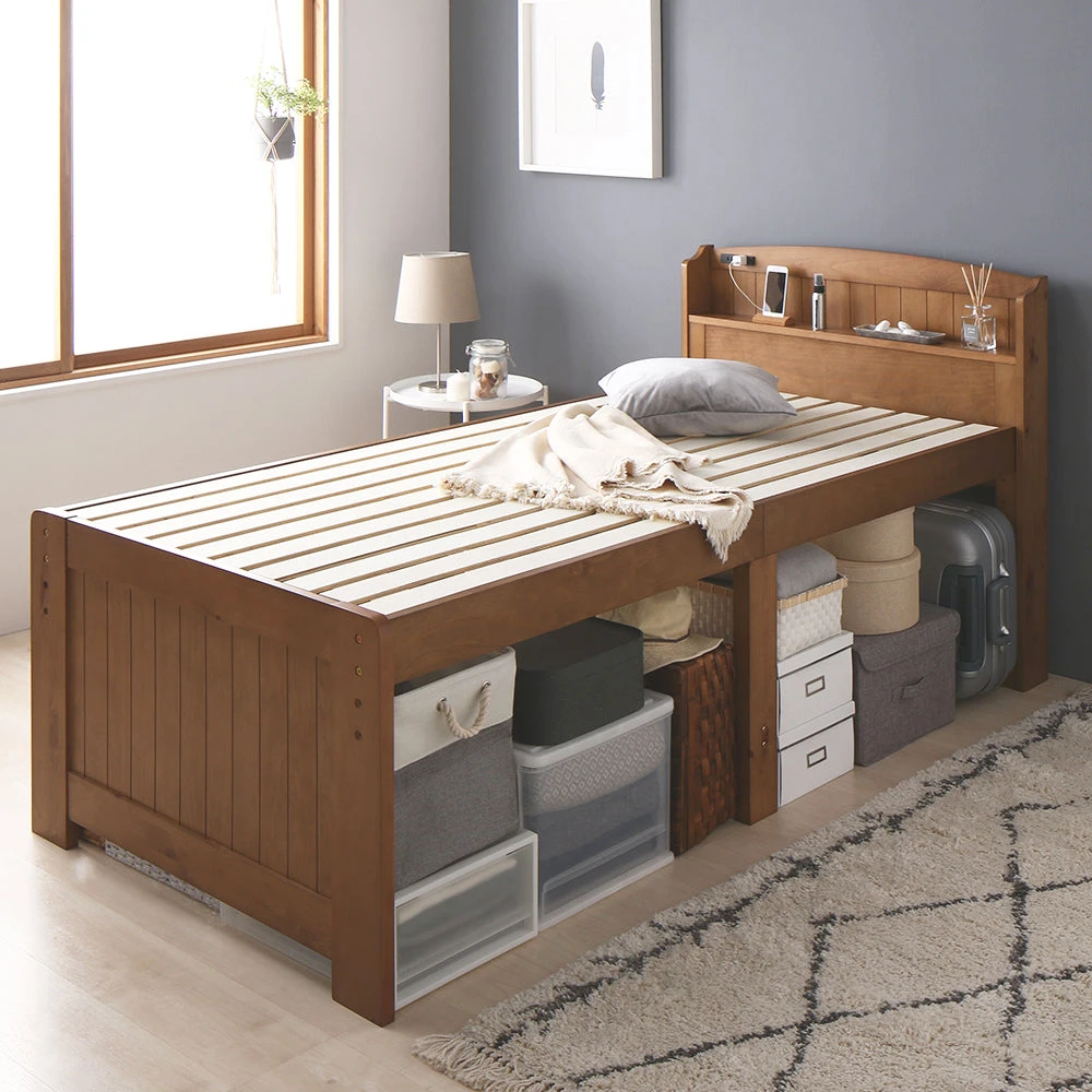 引き出しと高さ調整で床下収納のカントリー調棚付きベッド シングル ミドルタイプ[床下20~32cm] ライトブラウン フレームのみ