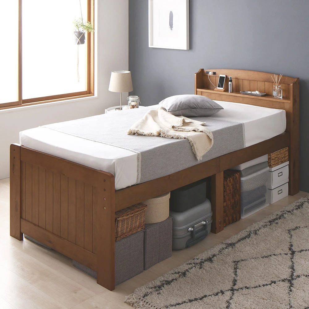 引き出しと高さ調整で床下収納のカントリー調棚付きベッド セミシングル(ショート丈) ミドルタイプ[床下20~32cm] ライトブラウン ポケットコイルマットレス付き