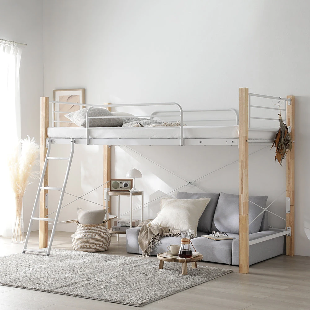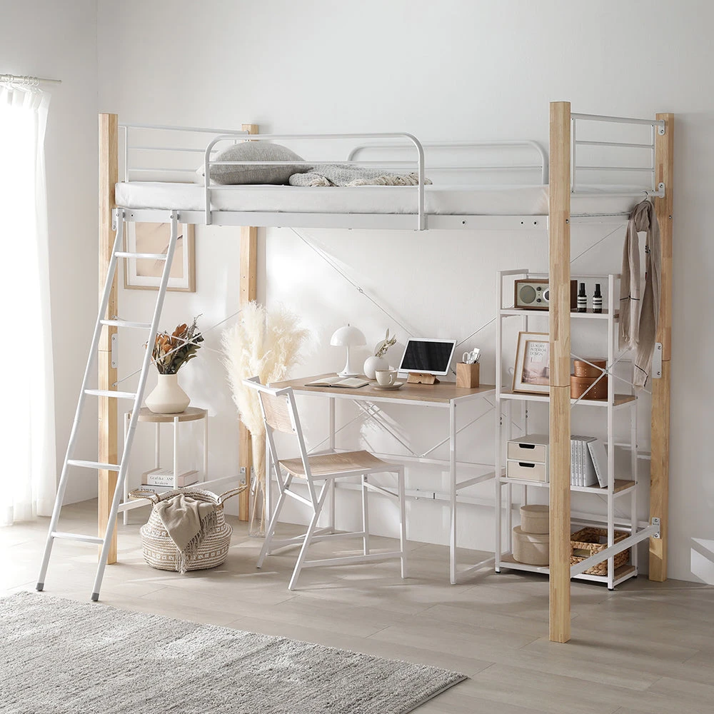 高さを選べて下部空間を賢く活用できるロフトベッド シングル ナチュラル×ホワイト 3つ折りポケットコイルマットレス付き ロータイプ