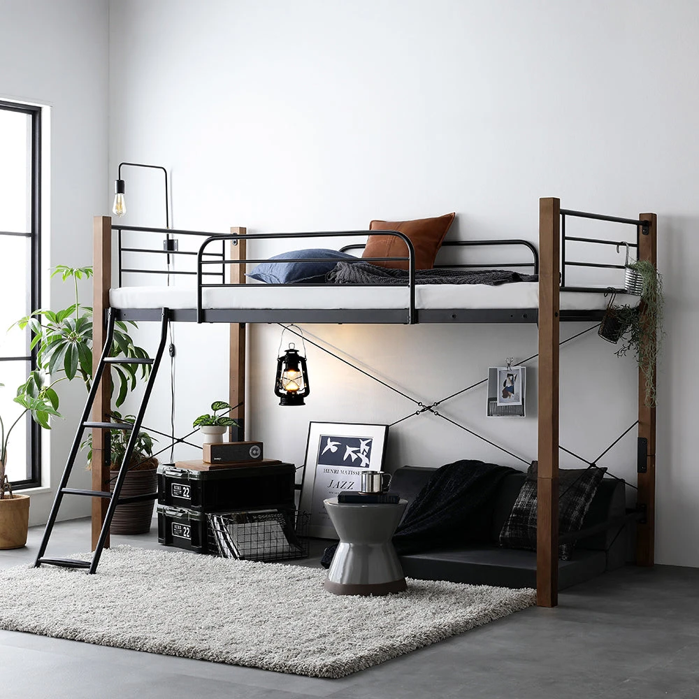 高さを選べて下部空間を賢く活用できるロフトベッド シングル ナチュラル×ブラック 3つ折りポケットコイルマットレス付き ロータイプ
