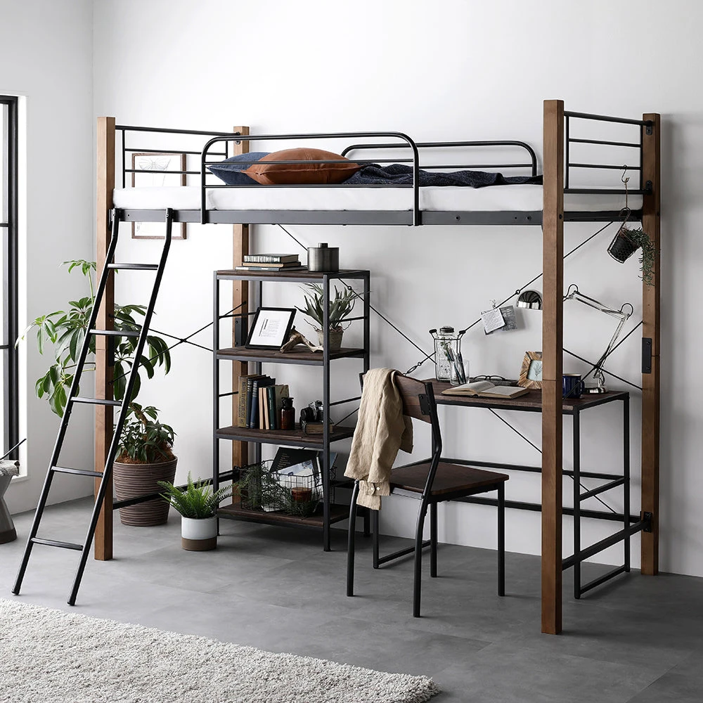 高さを選べて下部空間を賢く活用できるロフトベッド シングル ブラウン×ブラック ベッドフレームのみ ミドルタイプ