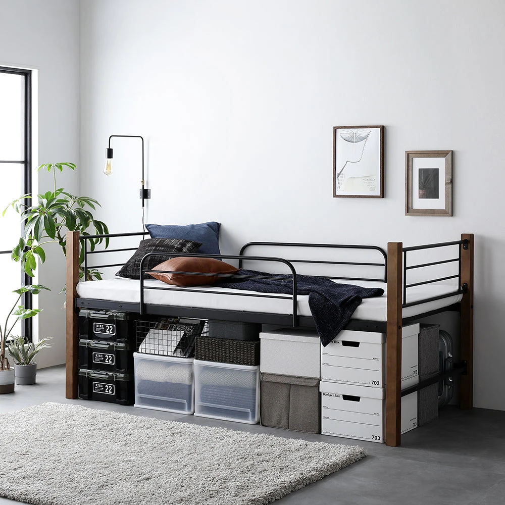 高さを選べて下部空間を賢く活用できるロフトベッド シングル ブラウン×ブラック 3つ折りポケットコイルマットレス付き ロータイプ