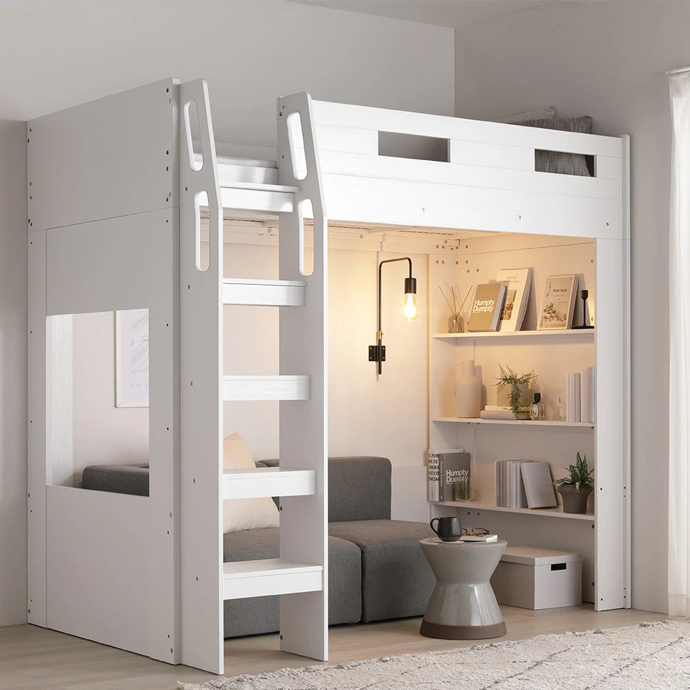ワークスペースと収納を一体にしたシステムロフトベッド シングル ホワイト 三つ折りポケットコイルマットレス付き