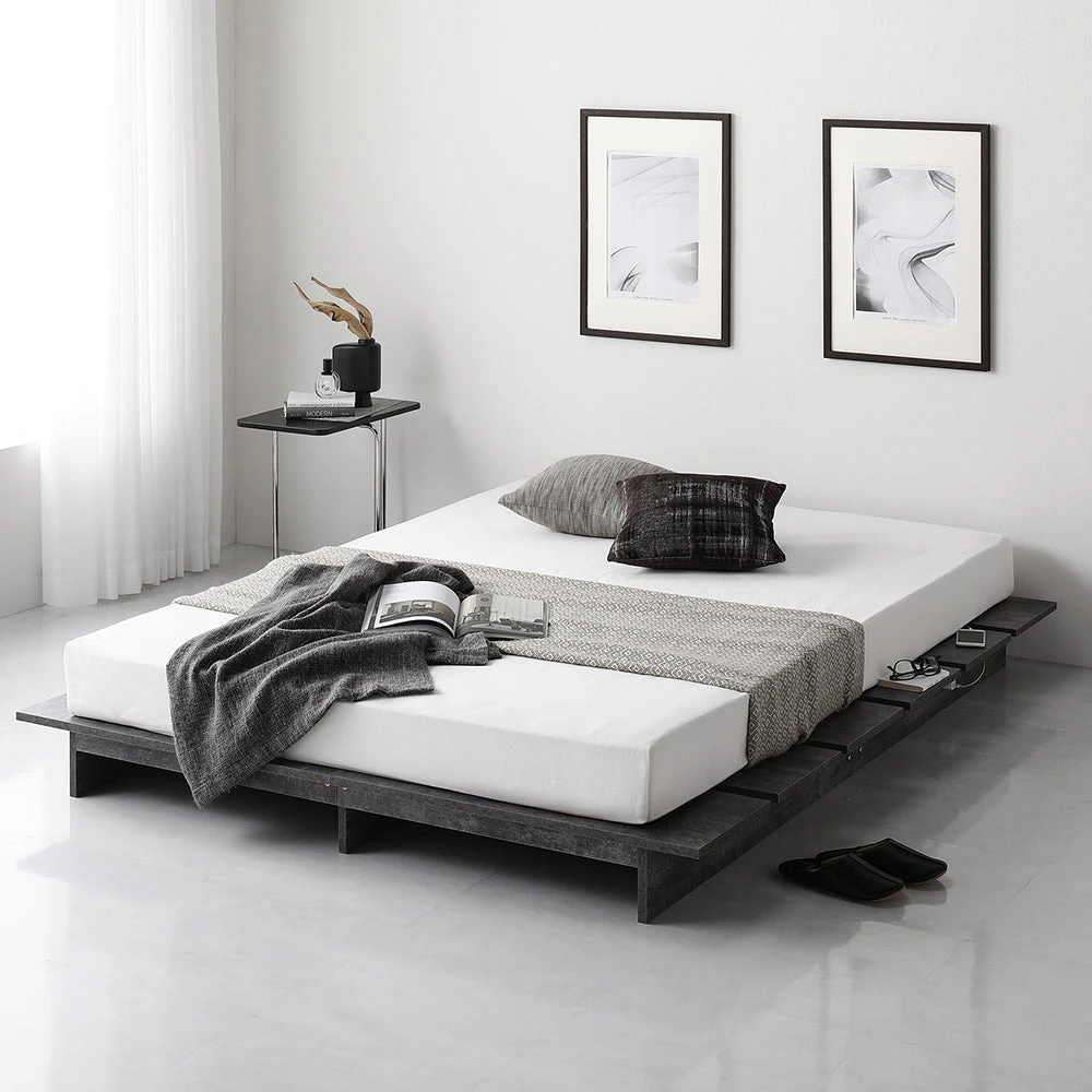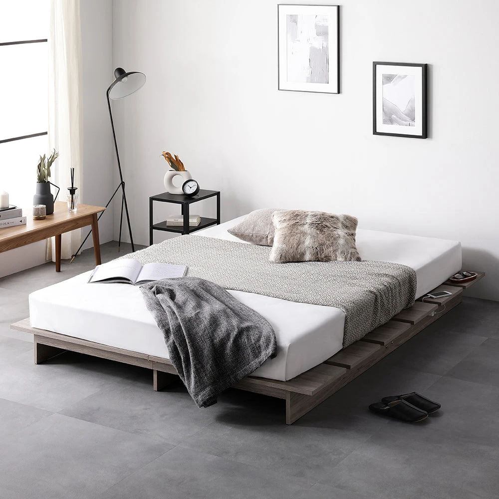 やわらかな灯りで夜の支度がしやすい低重心のステージベッド ダブル ストーングレー ポケットコイルマットレス付き