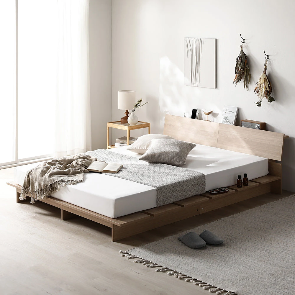 やわらかな灯りで夜の支度がしやすい低重心のステージベッド ダブル シャビーオーク 国産ポケットコイルマットレス付き(ハード)