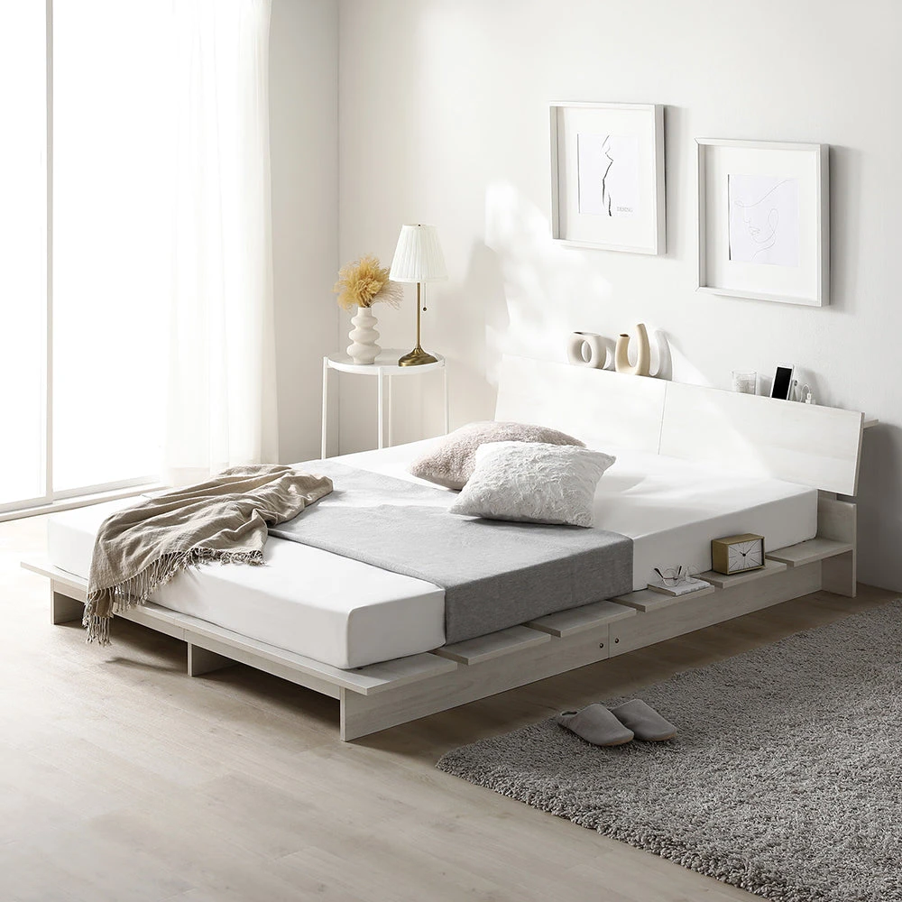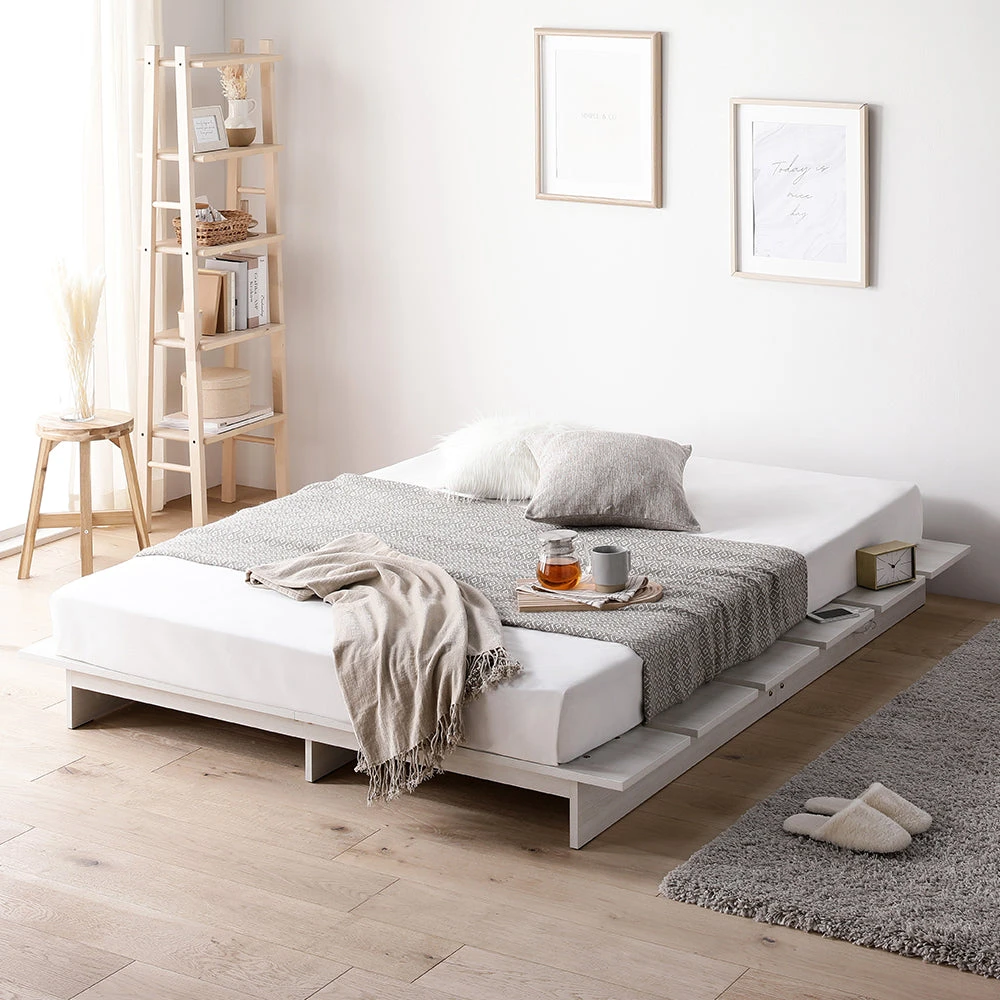 やわらかな灯りで夜の支度がしやすい低重心のステージベッド ダブル シャビーオーク ボンネルコイルマットレス付き