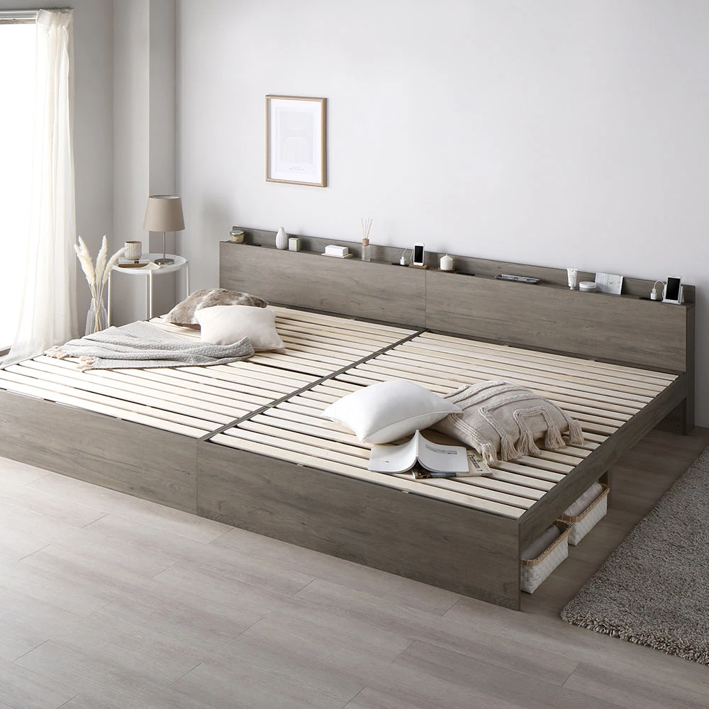 低めで広く見える空間設計と静かな使い心地の高さ調整すのこベッド ワイドキング280cm(D+D) グレージュ ベッドフレームのみ
