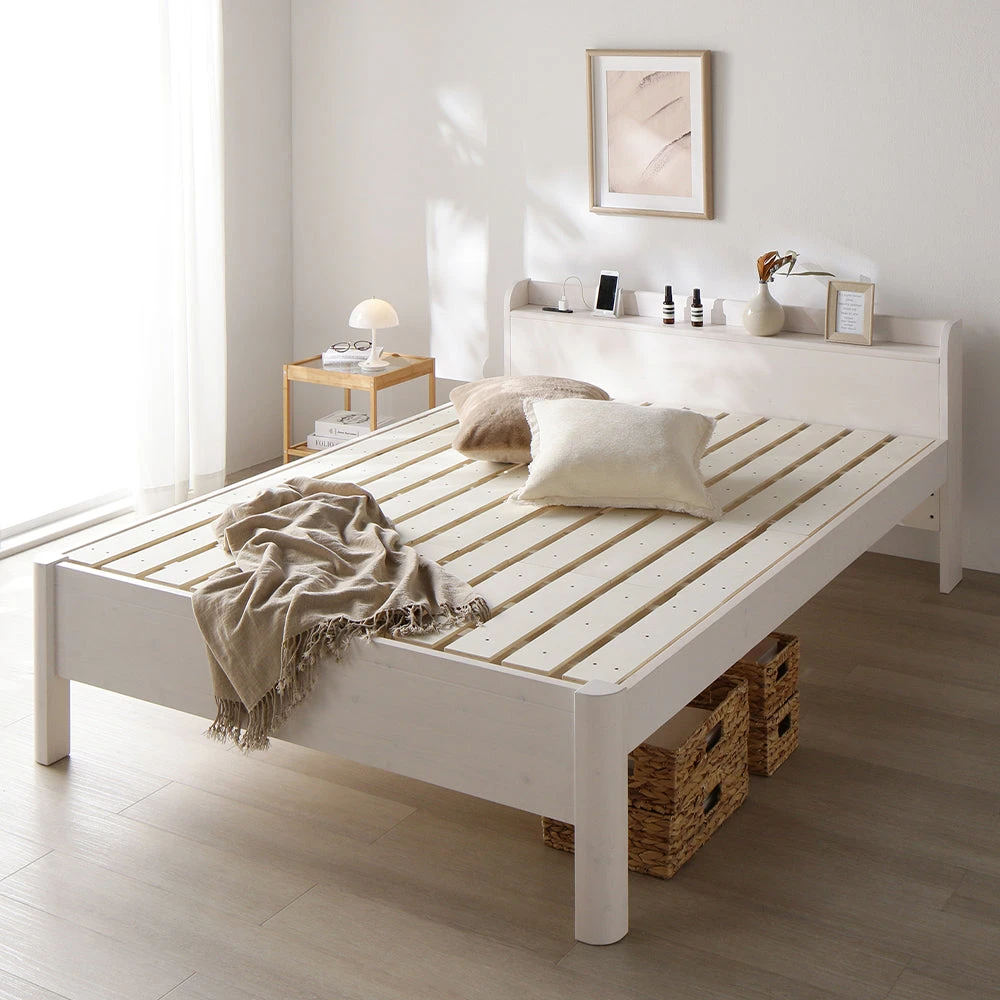 枕元が片付き充電も整う快適な寝環境を叶える耐荷重650kg頑丈すのこベッド ダブル ホワイト ベッドフレームのみ