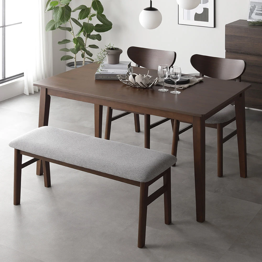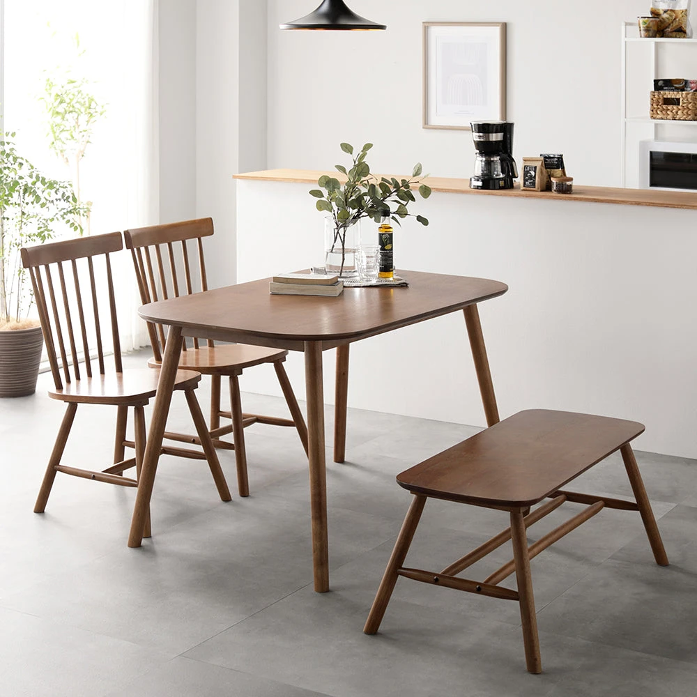 曲線の背もたれが包み込む、天然木の温もりを愉しむ北欧ダイニング ブラウン 4点セット(テーブル幅120cm+チェア2脚+ベンチ)