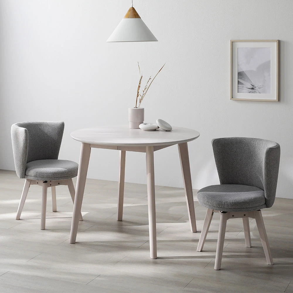 まるく囲んで会話が弾む、回転チェアが便利な北欧ダイニング ホワイト×ライトグレー 3点セット(円形テーブル+回転チェア2脚)