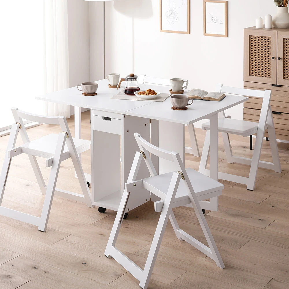 片付けやレイアウト替えがしやすい木製の北欧ダイニング ホワイト 5点セット(テーブル+チェア4脚)