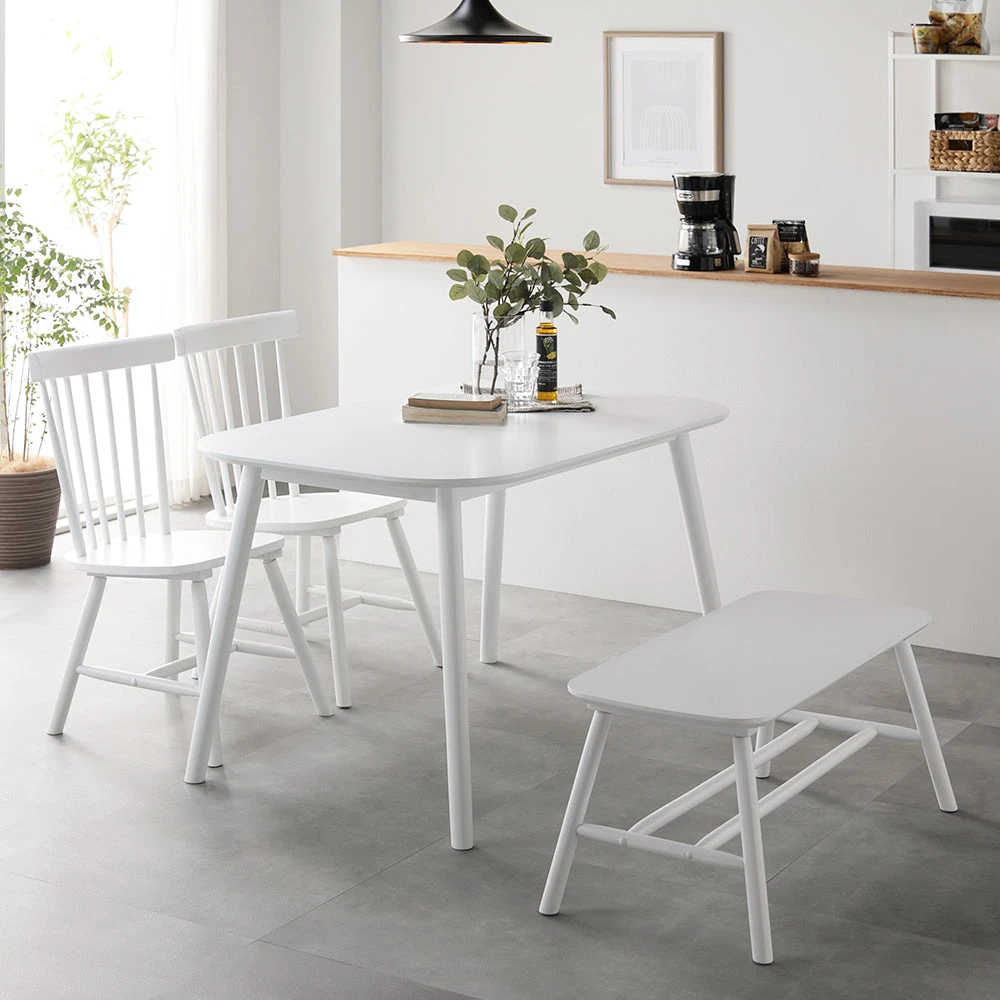 曲線の背もたれが包み込む、天然木の温もりを愉しむ北欧ダイニング ホワイト 4点セット(テーブル幅120cm+チェア2脚+ベンチ)