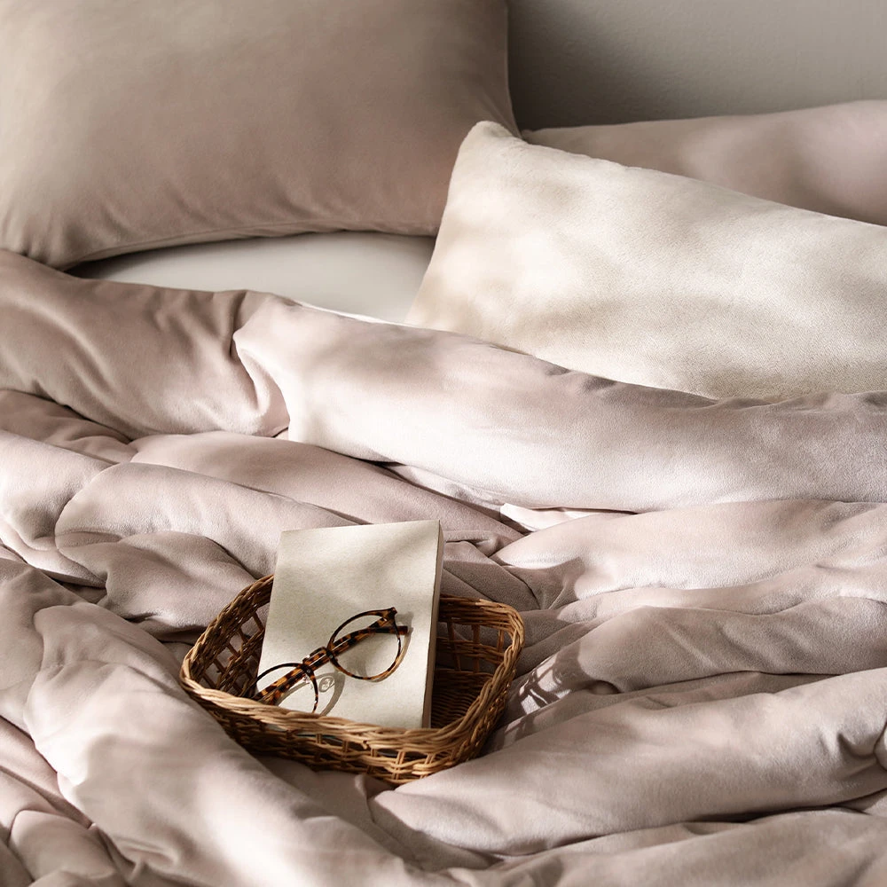 なめらかでもっちり包み込み、丸洗いで清潔が続く暖かベロア寝具 クイーン~キング ボックスシーツ+枕カバーセット モカグレージュ
