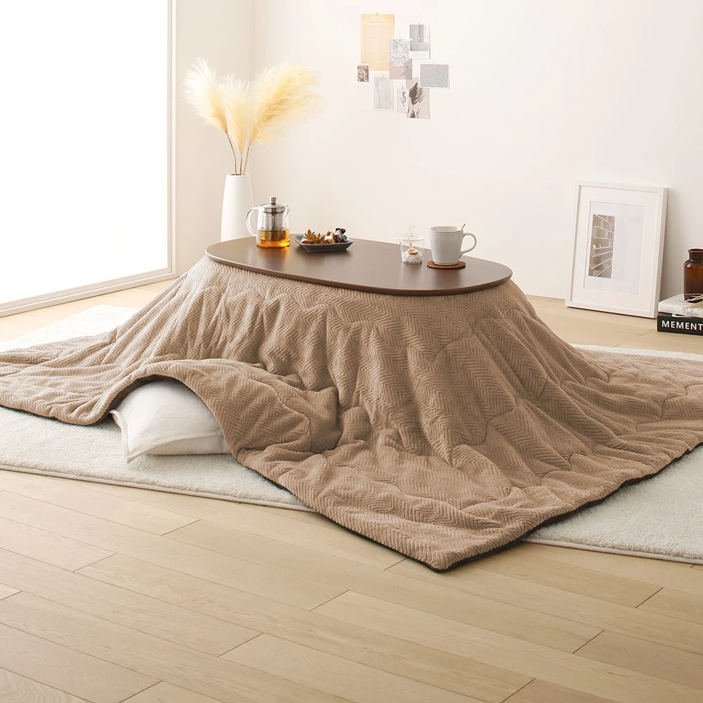 小さなお部屋にも収まり良いやさしいフォルムの楕円形こたつ2点セット(こたつテーブル+掛け布団) テーブル:ナチュラル 掛け布団:ブラウン