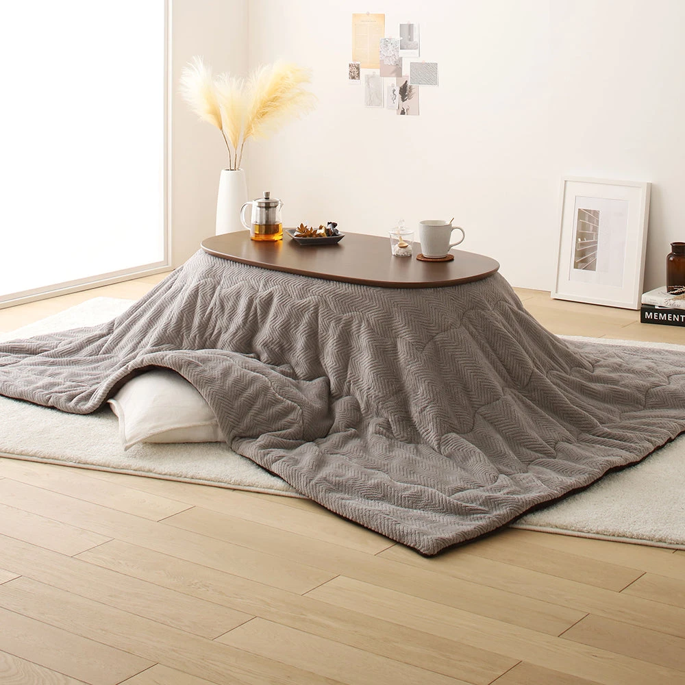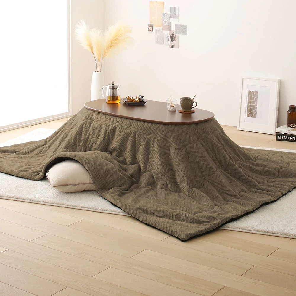 小さなお部屋にも収まり良いやさしいフォルムの楕円形こたつ2点セット(こたつテーブル+掛け布団) テーブル:ウォルナットブラウン 掛け布団:ブラウン