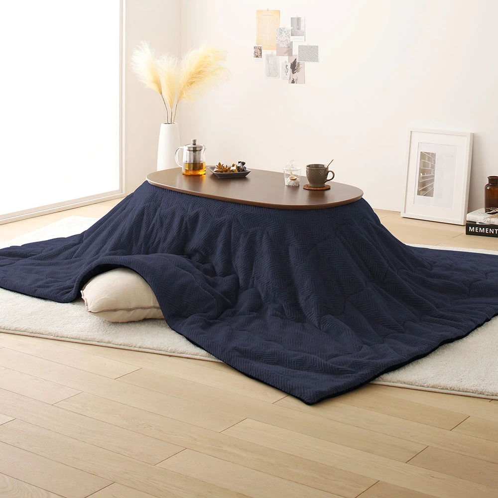 小さなお部屋にも収まり良いやさしいフォルムの楕円形こたつ2点セット(こたつテーブル+掛け布団) テーブル:ウォルナットブラウン 掛け布団:ネイビー