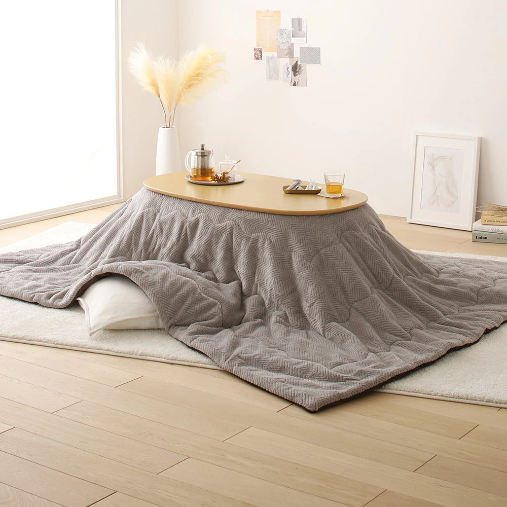 小さなお部屋にも収まり良いやさしいフォルムの楕円形こたつ2点セット(こたつテーブル+掛け布団) テーブル:ナチュラル 掛け布団:グレー