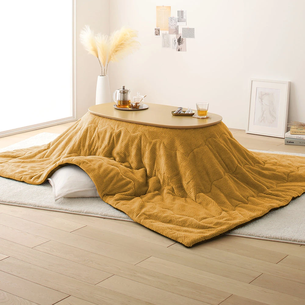 小さなお部屋にも収まり良いやさしいフォルムの楕円形こたつ2点セット(こたつテーブル+掛け布団) テーブル:ナチュラル 掛け布団:イエロー