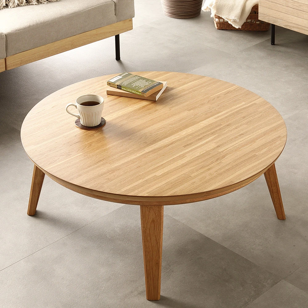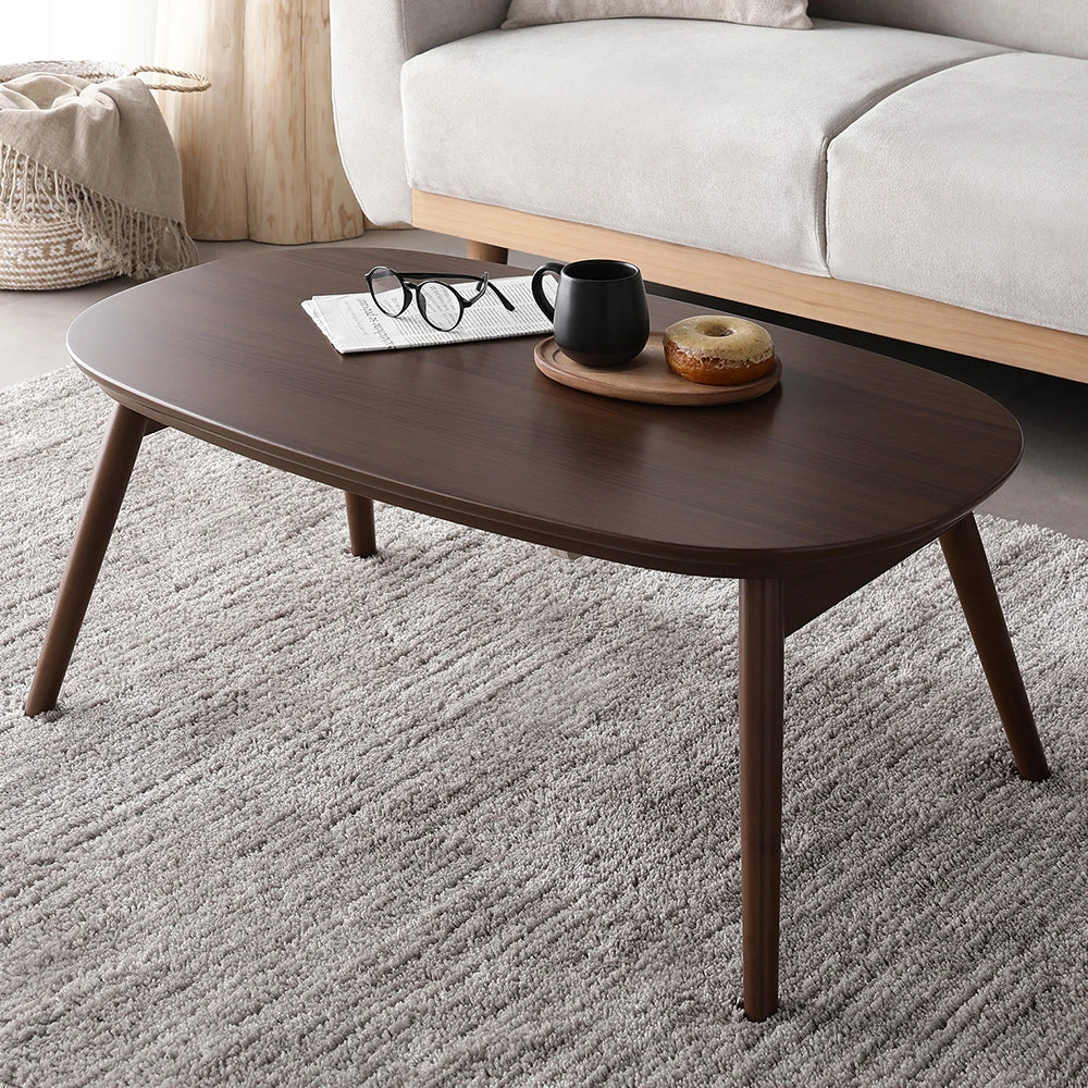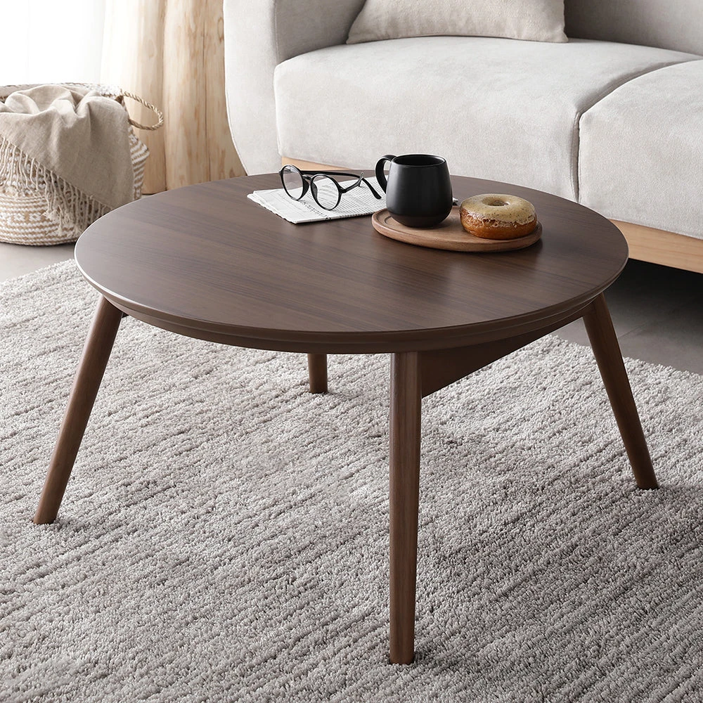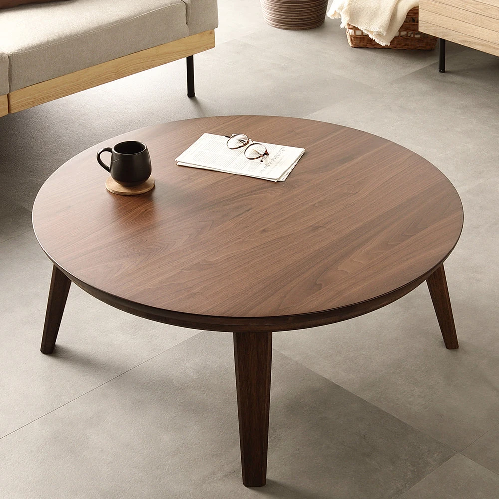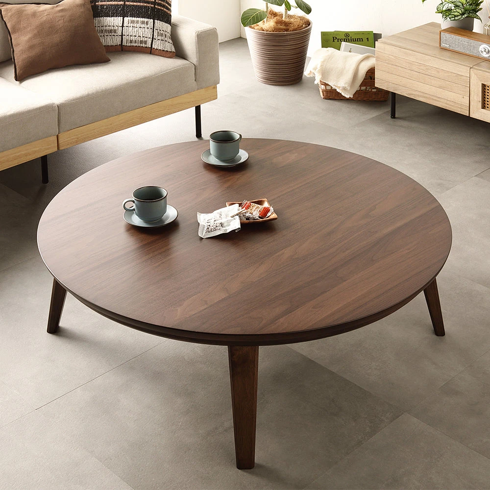 1木目の温もりと会話が弾むやさしい形で暮らし整う円形こたつテーブル ウォルナット 85cm