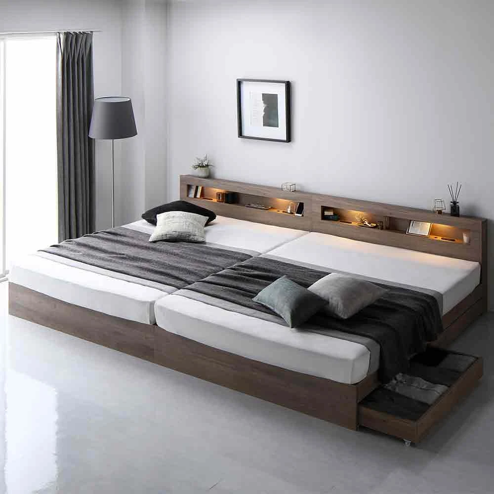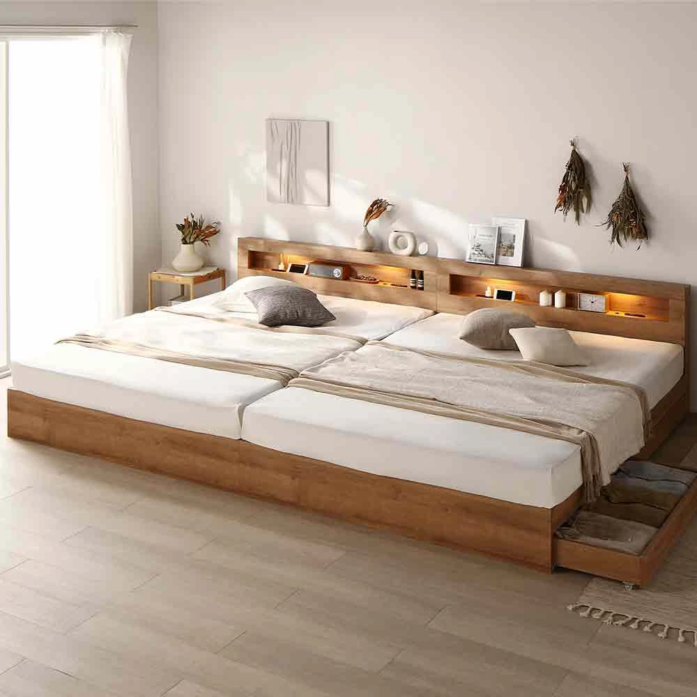 連結ベッド ワイドキング 収納付き シャビーオーク ワイドキング240cm(SD+SD) 2層ポケットコイルマットレス付き