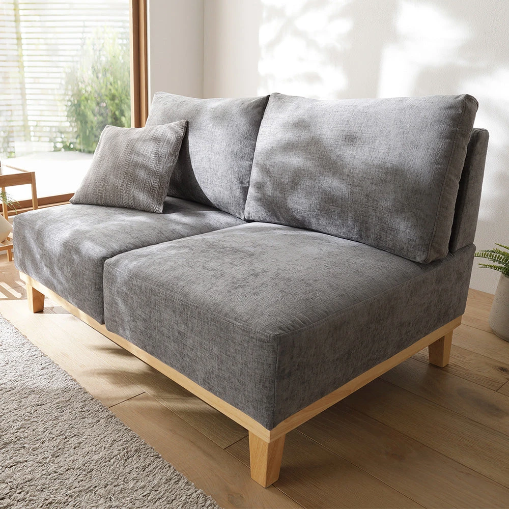フェザータッチのふんわり感と白木の軽やかさが映えるファブリックソファ グレージュ 2人掛け単品