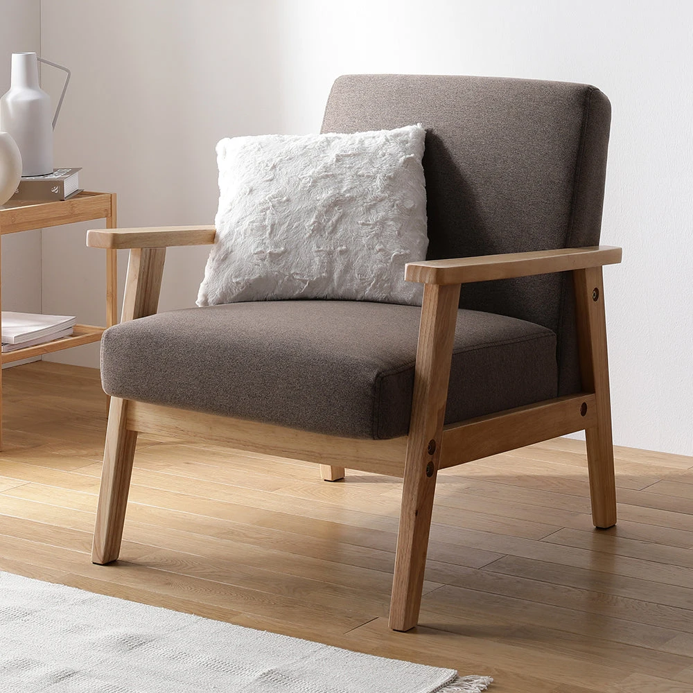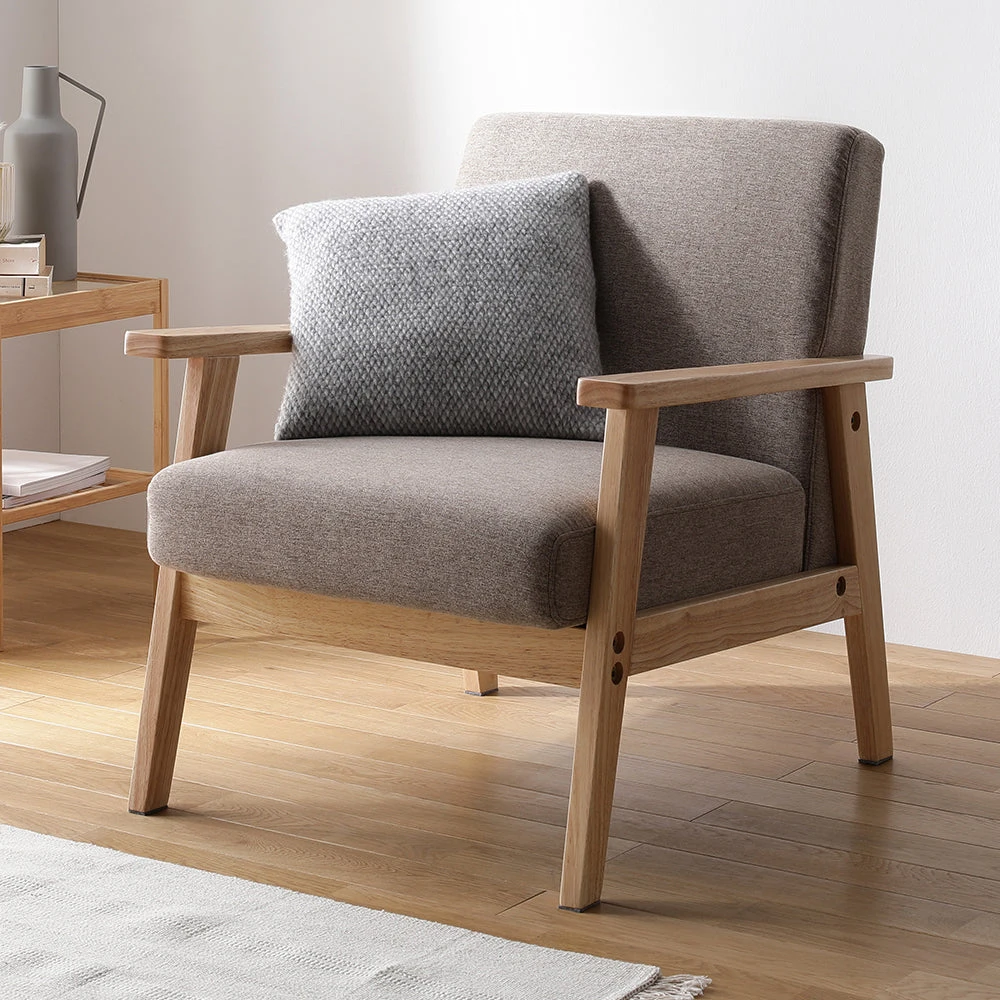 木の温もりと直線美で空間を整える北欧風のファブリックソファ グレージュ 1人掛け