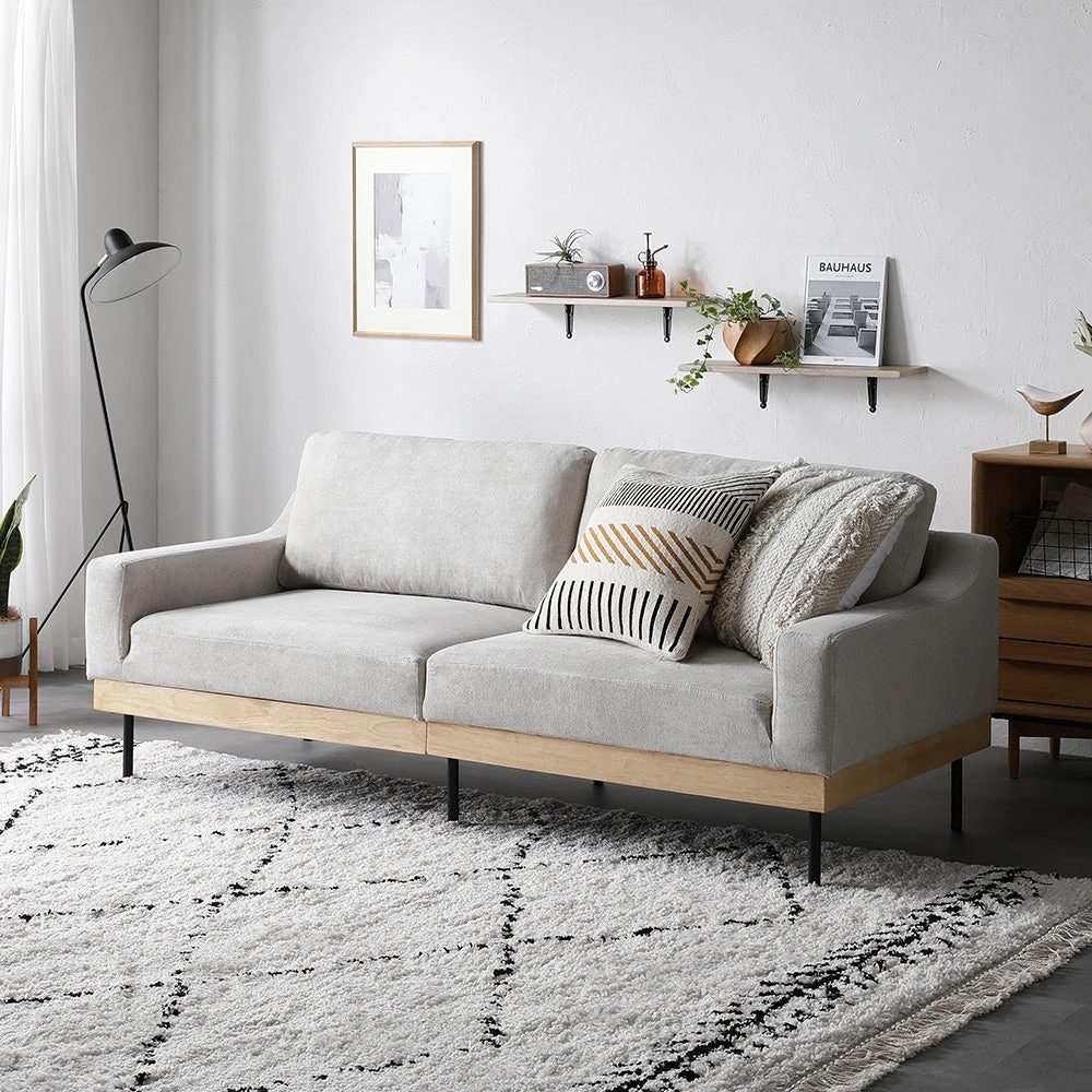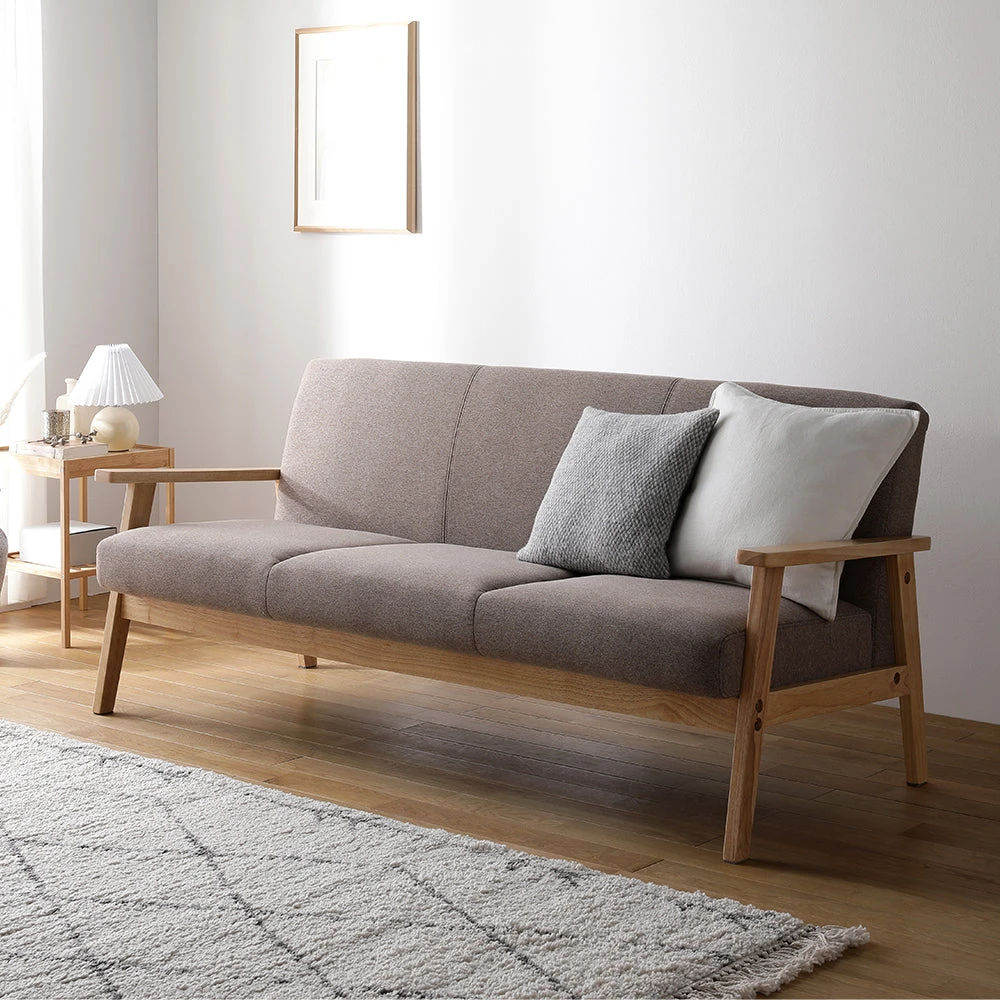 木の温もりと直線美で空間を整える北欧風のファブリックソファ グレージュ 3人掛け