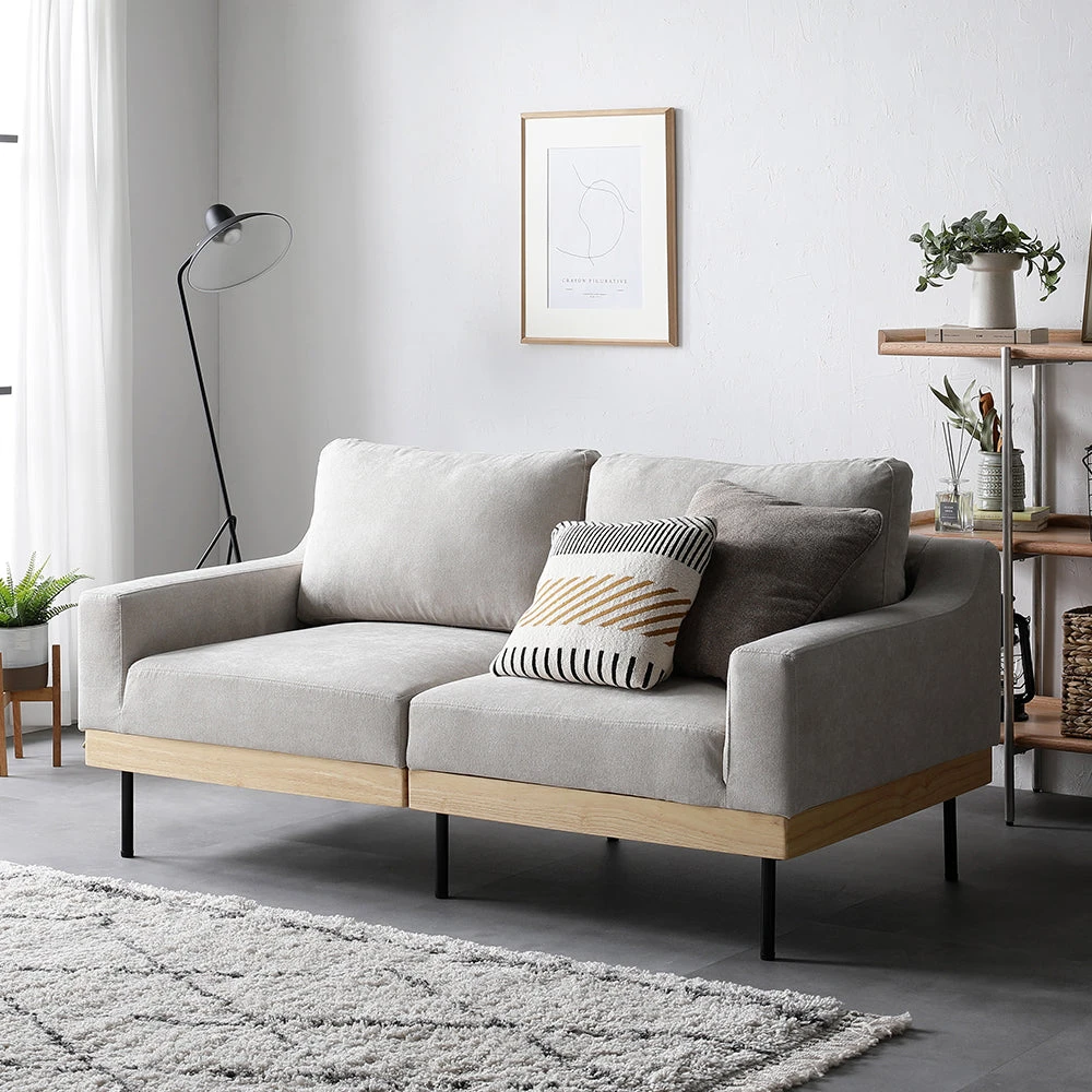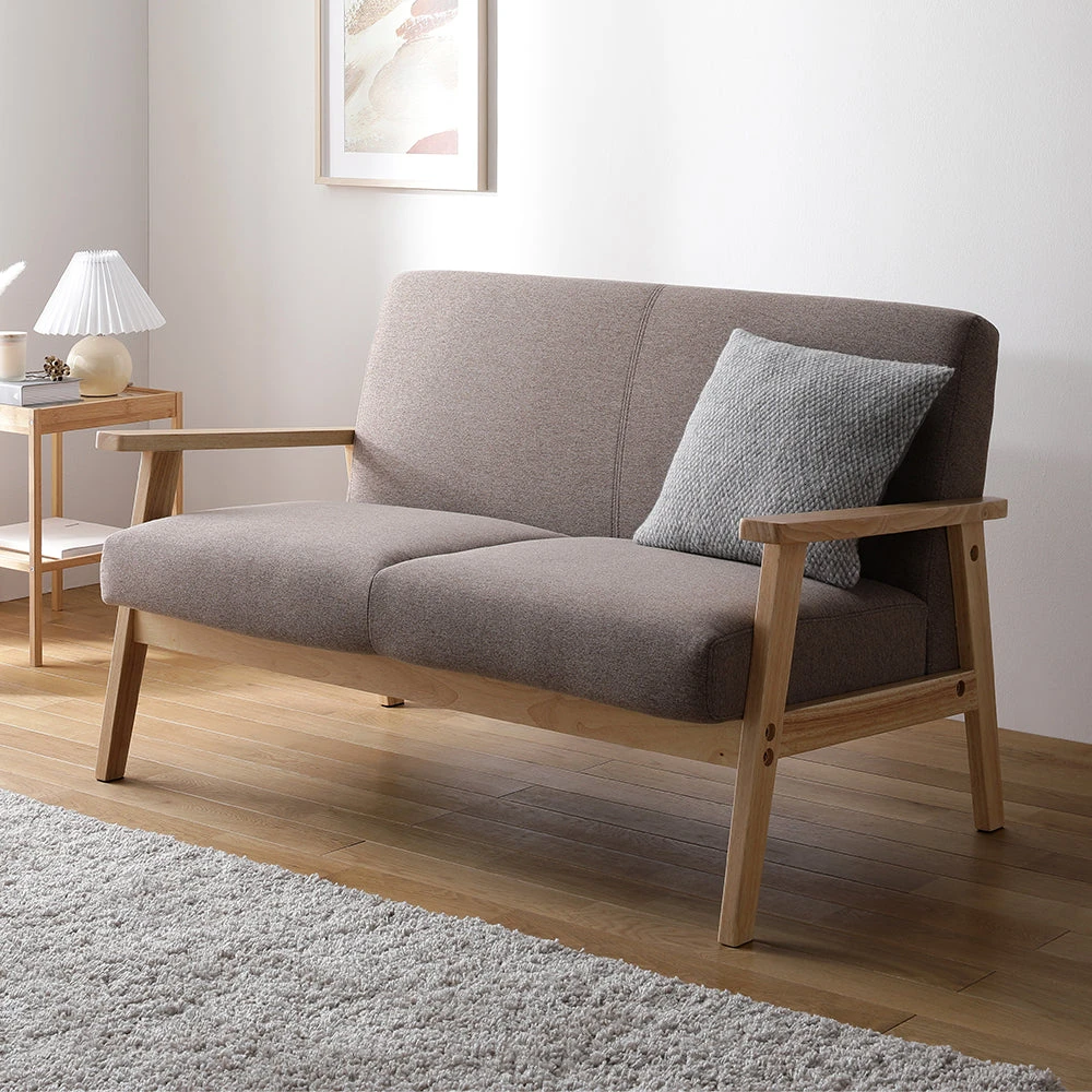 木の温もりと直線美で空間を整える北欧風のファブリックソファ グレージュ 2人掛け