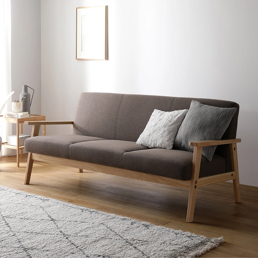 木の温もりと直線美で空間を整える北欧風のファブリックソファ モカブラウン 3人掛け