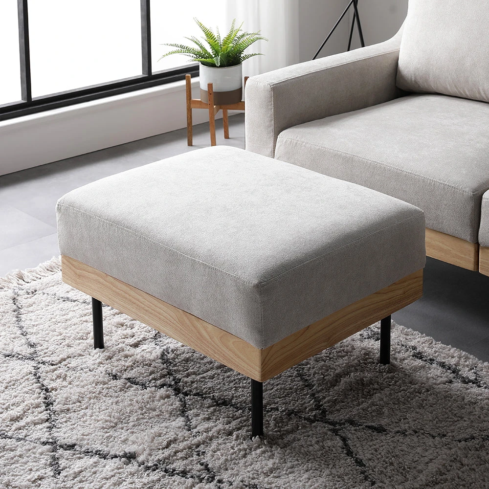 フェザータッチのふんわり感と白木の軽やかさが映えるファブリックソファ グレージュ オットマン単品
