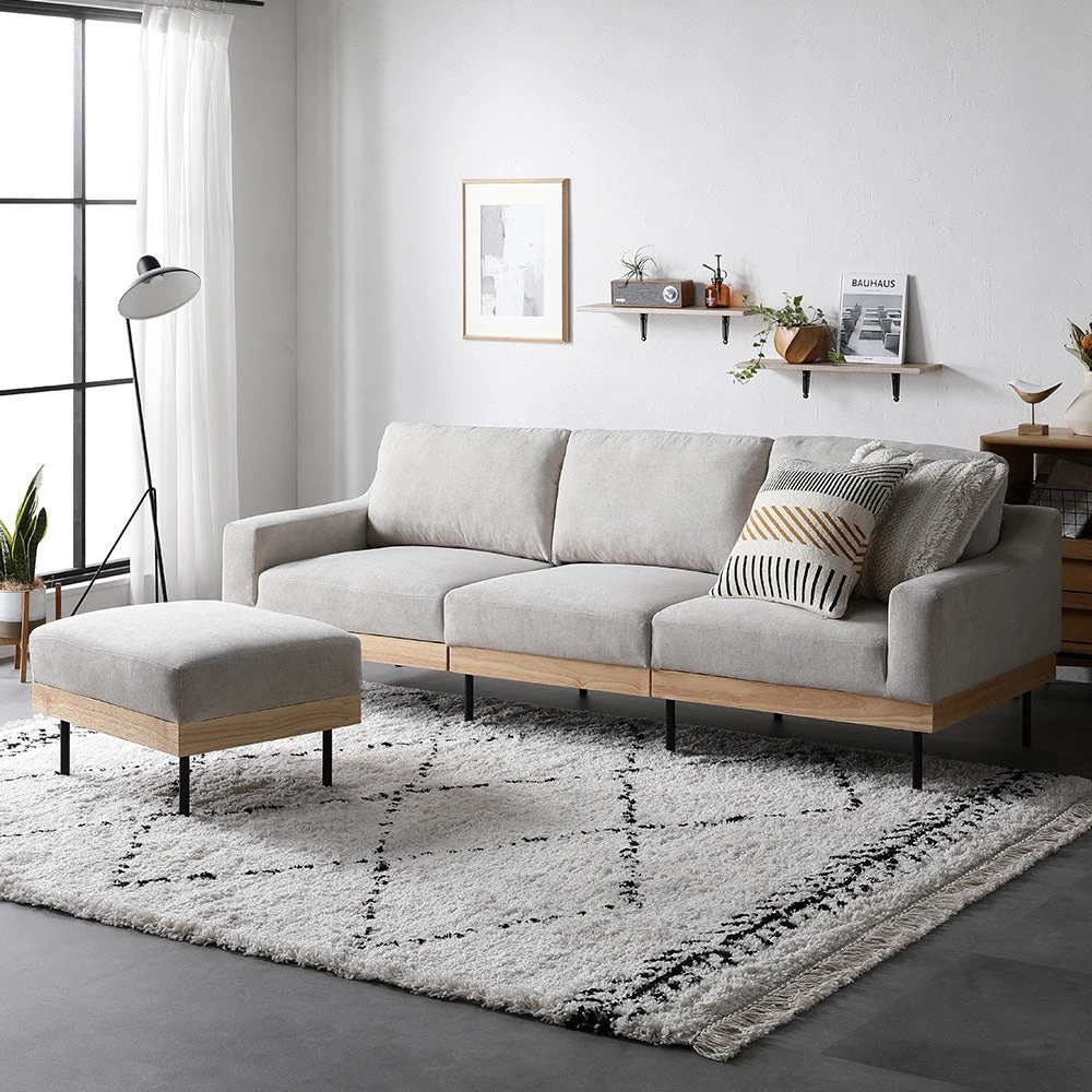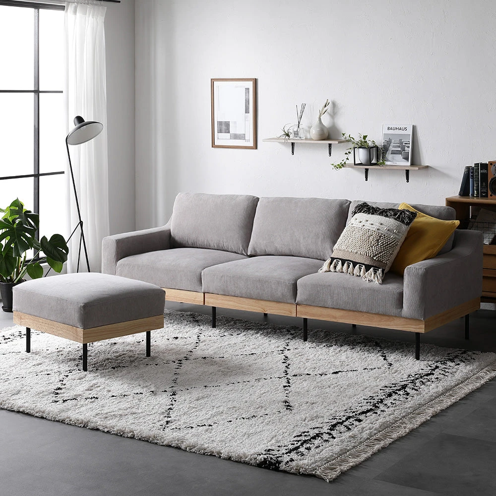 フェザータッチのふんわり感と白木の軽やかさが映えるファブリックソファ グレージュ 3人掛け+オットマンセット