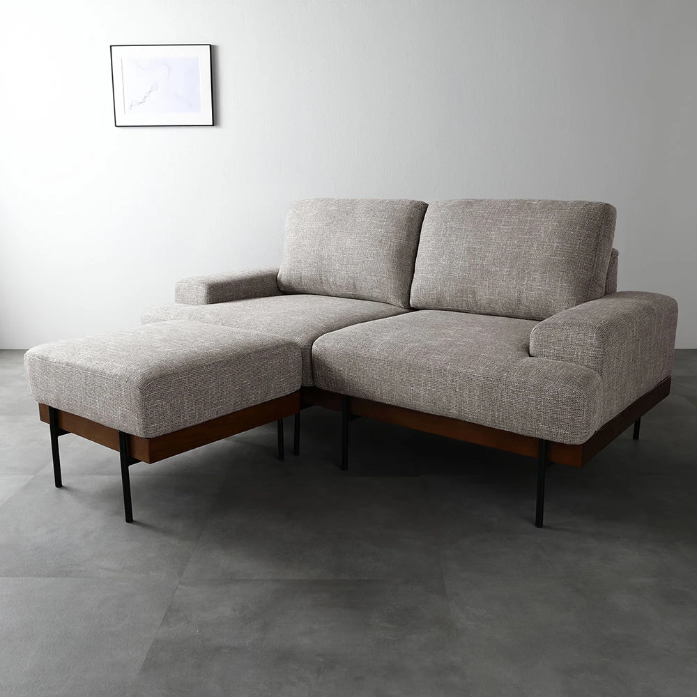 フェザータッチのふんわり感と白木の軽やかさが映えるファブリックソファ グレージュ 2人掛け+オットマンセット