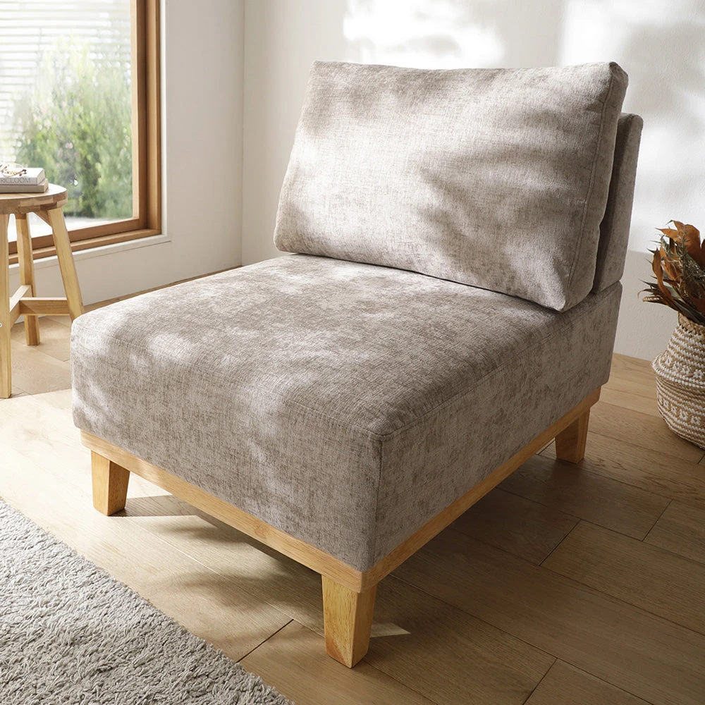肘のない開放設計で動線を保ち快適にくつろげるファブリックソファ 1人掛け グレージュ 1人掛け単品