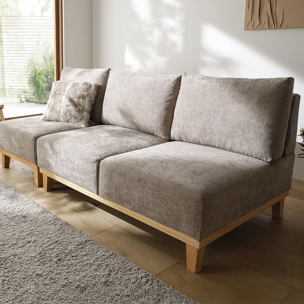 肘のない開放設計で動線を保ち快適にくつろげるファブリックソファ 3人掛け グレージュ 3人掛け単品