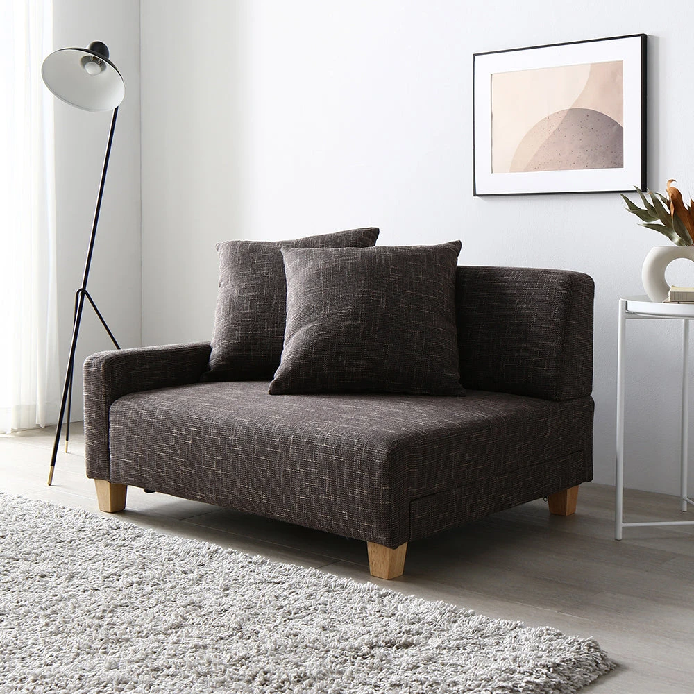 肘のない開放設計で動線を保ち快適にくつろげるファブリックソファ 1人掛け ダークブラウン 1人掛け単品