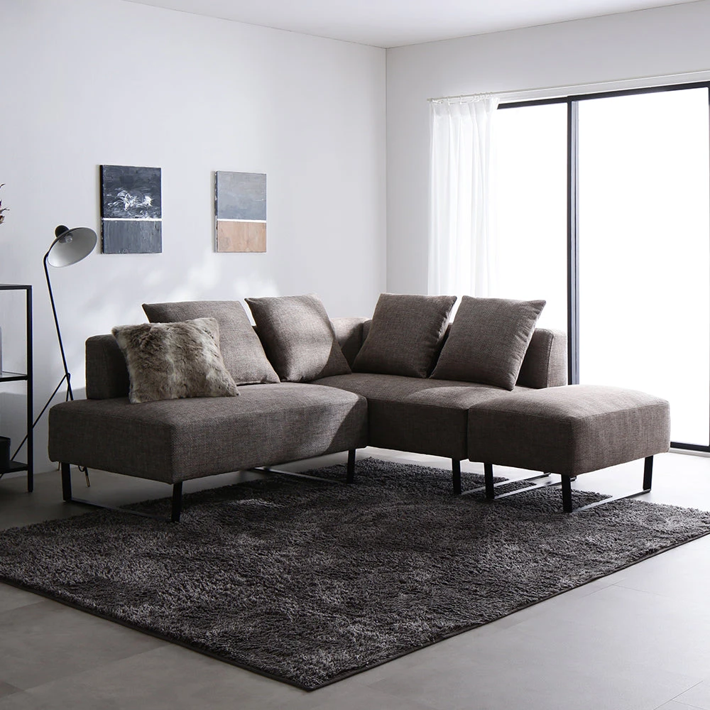 部屋の形に合わせて形を変え暮らしに寄り添うファブリックソファ ライトグレー×ブラック 3人掛け+オットマン