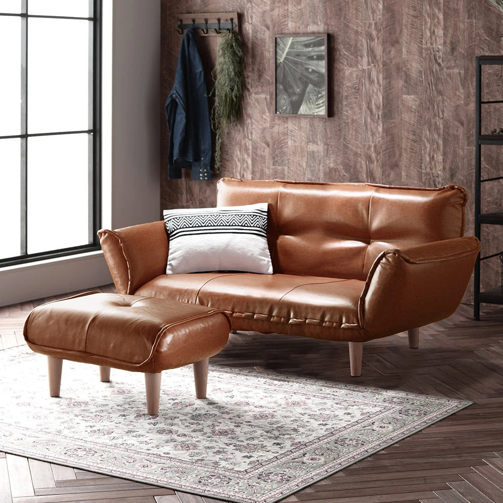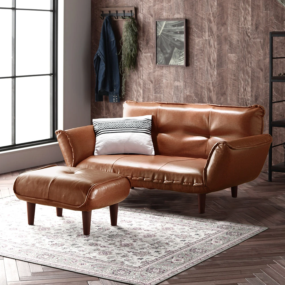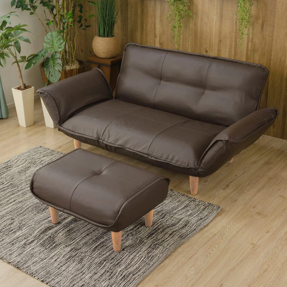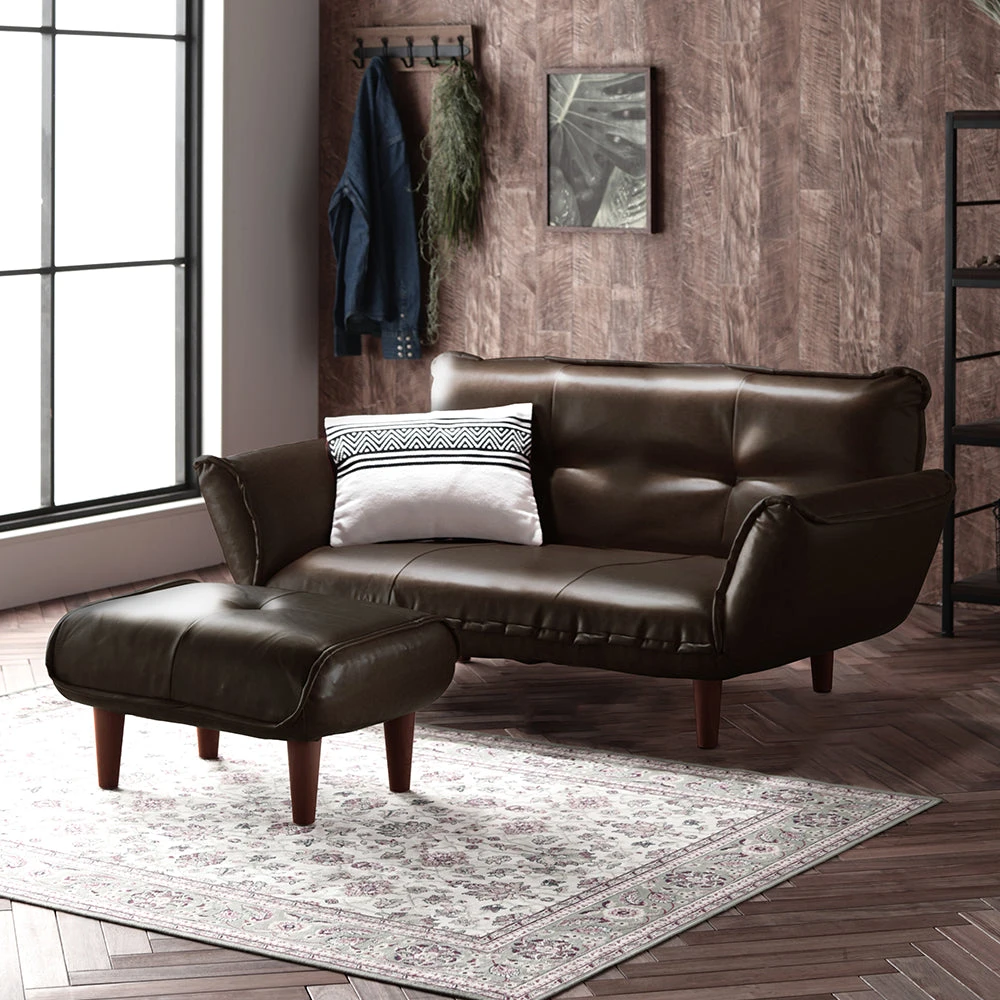 静かに角度を変えて姿勢を整える日本製のレザーソファ PVC ブラウン 2人掛けカウチ(2人掛け+オットマン)