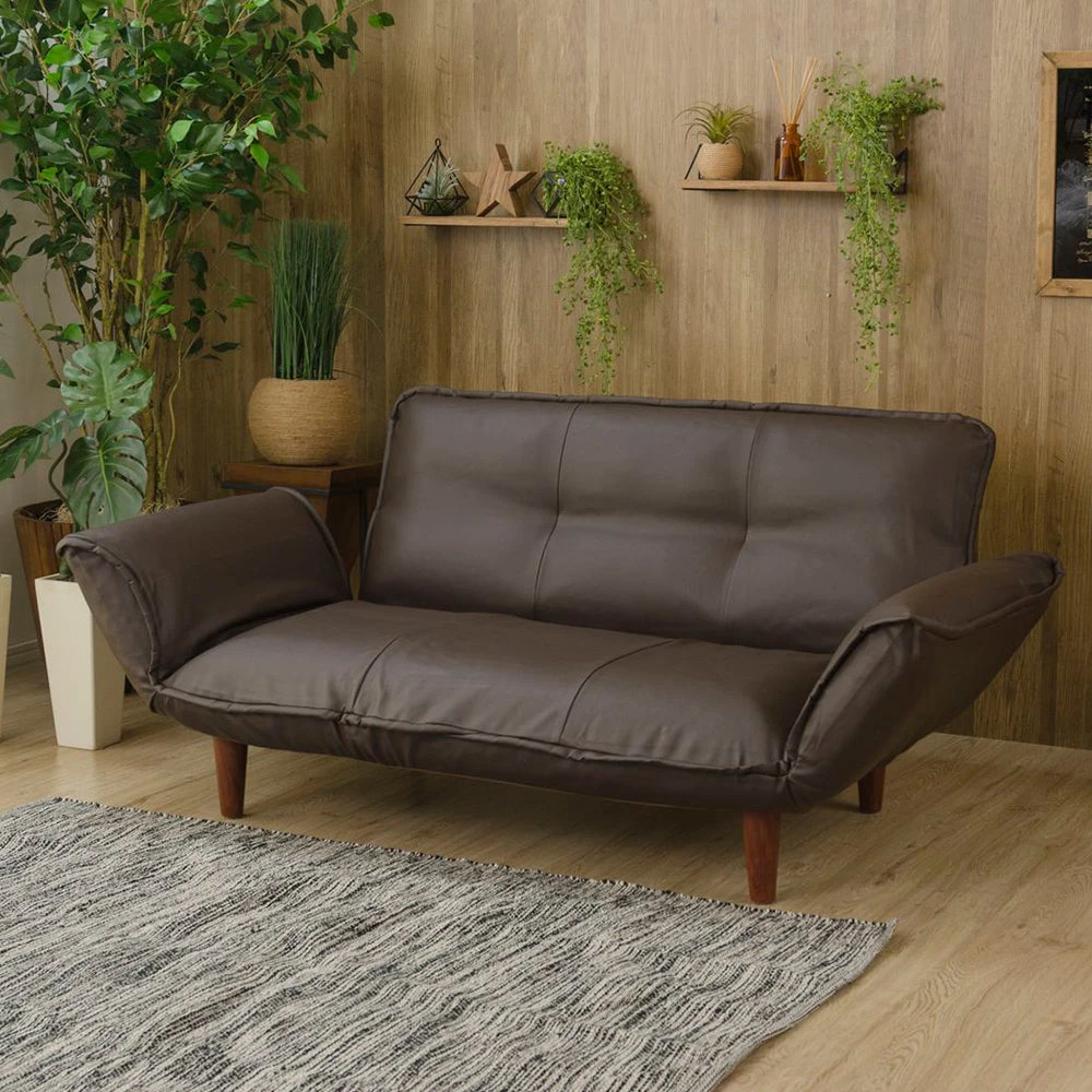 静かに角度を変えて姿勢を整える日本製のレザーソファ PVC ブラウン 2人掛け単品