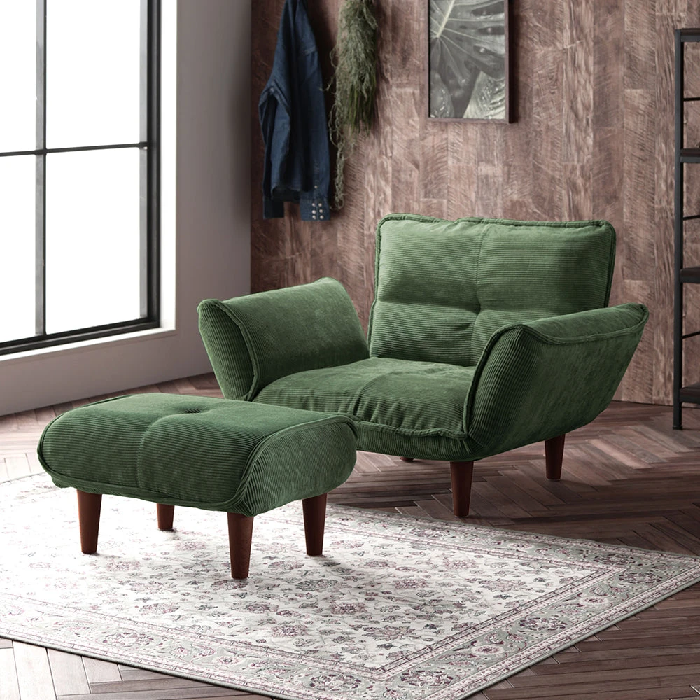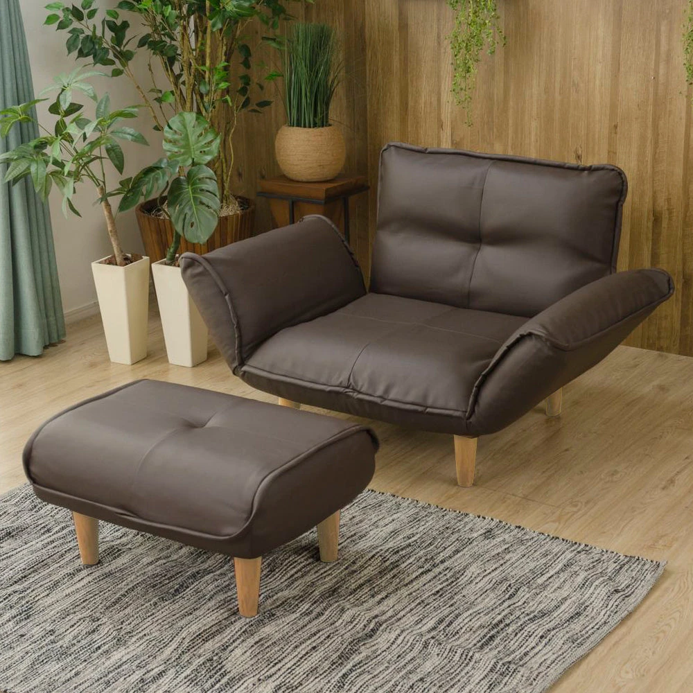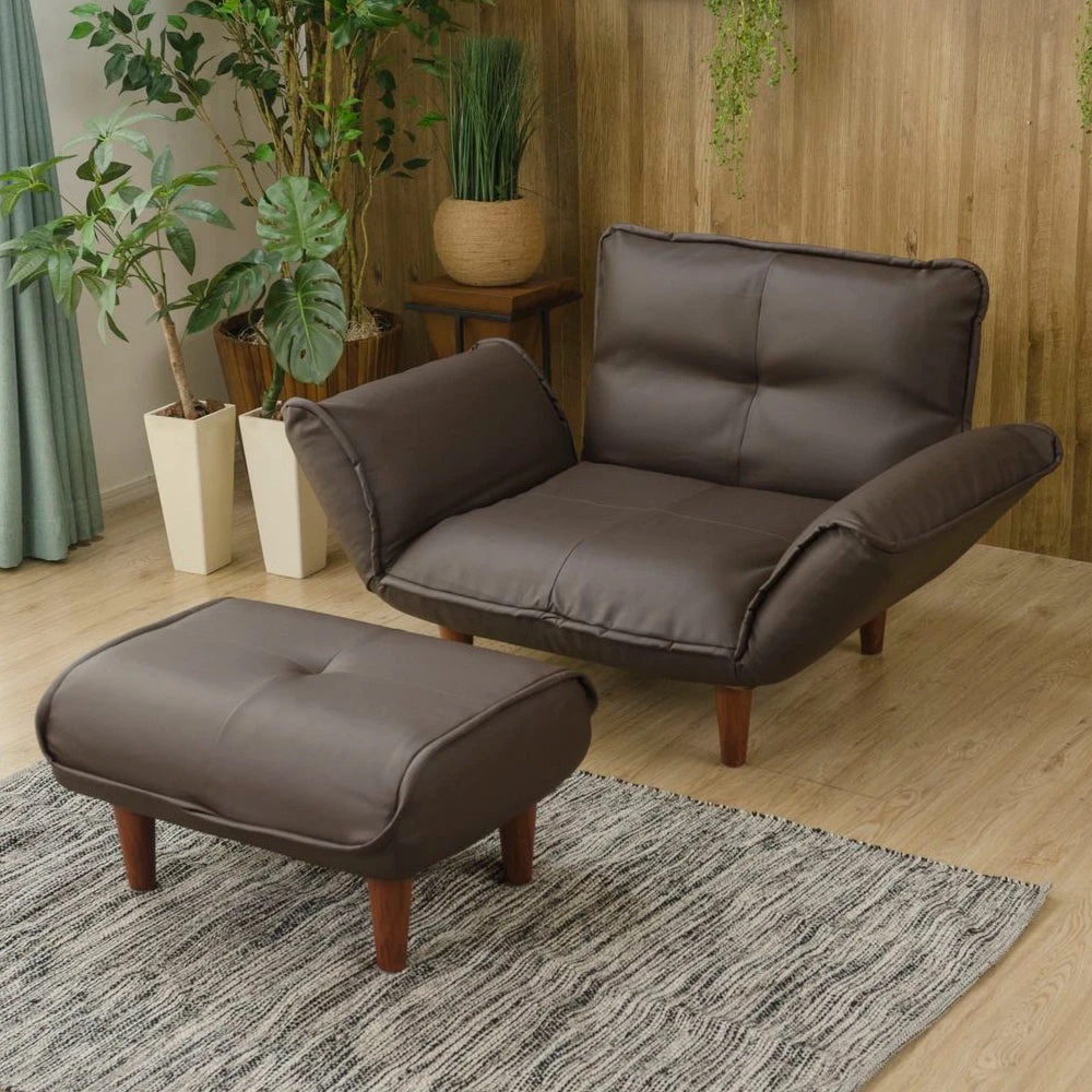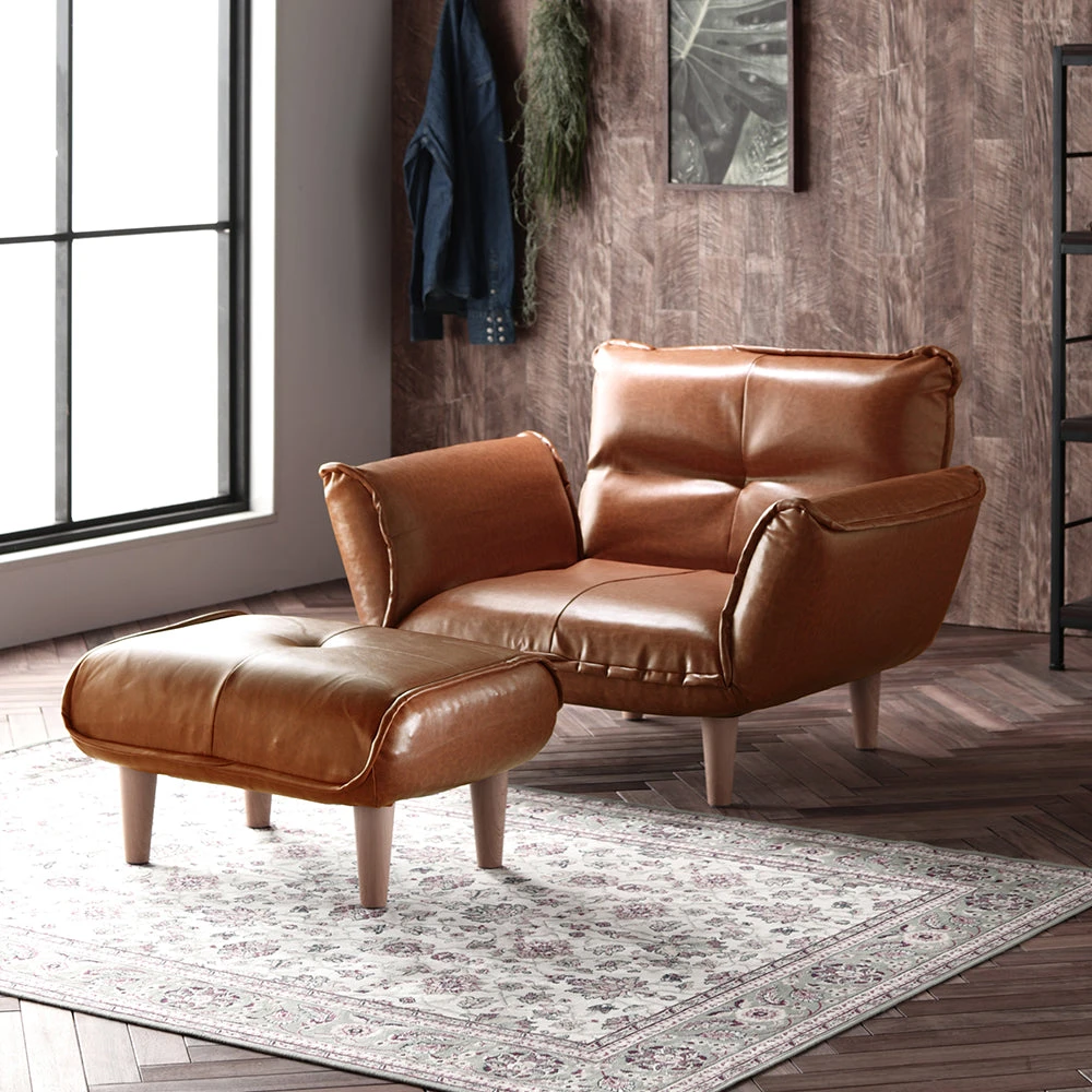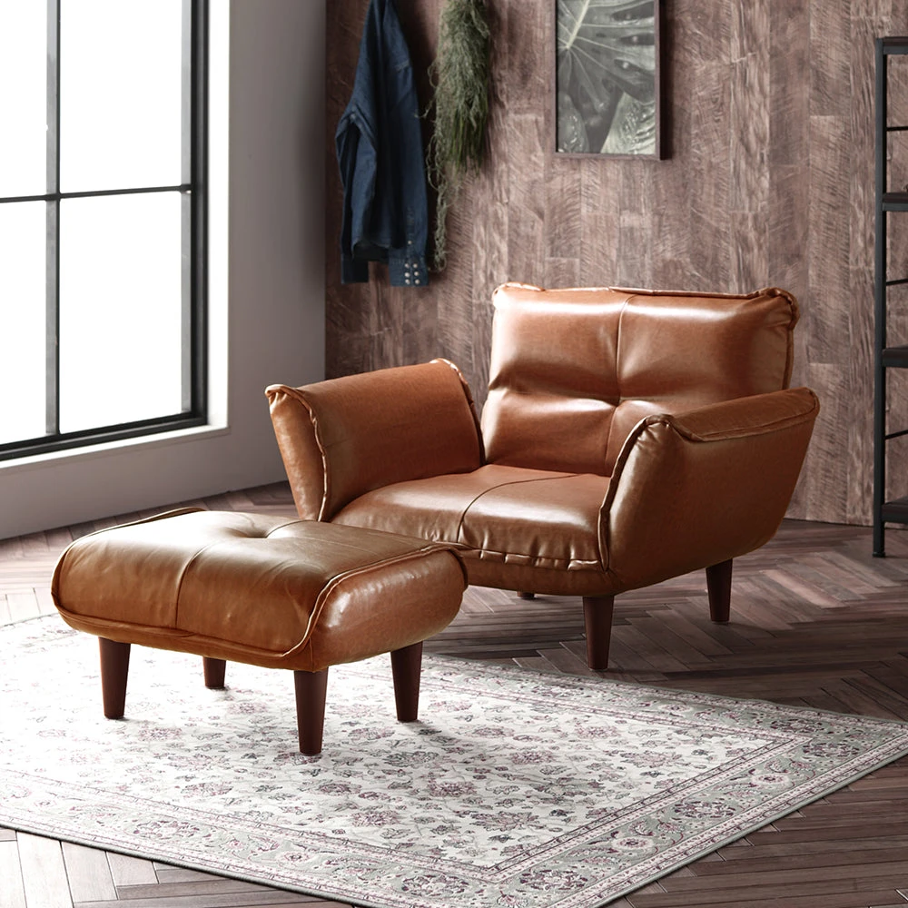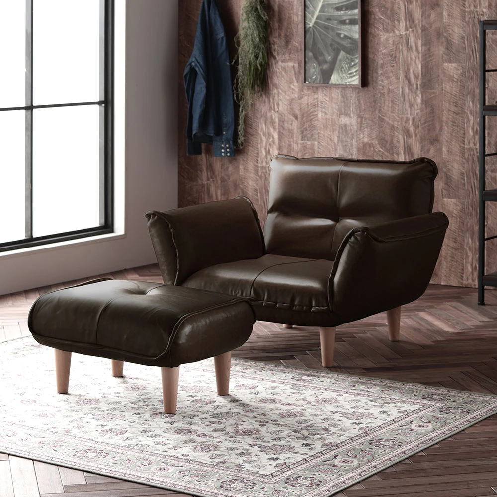 静かに角度を変えて姿勢を整える日本製のレザーソファ PVC ブラウン 1人掛けカウチ(1人掛け+オットマン)