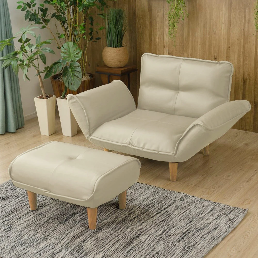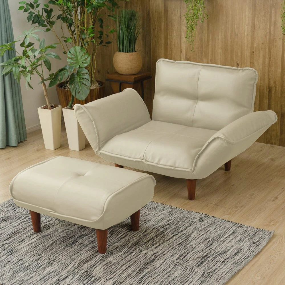 静かに角度を変えて姿勢を整える日本製のレザーソファ PVC アイボリー 1人掛けカウチ(1人掛け+オットマン)