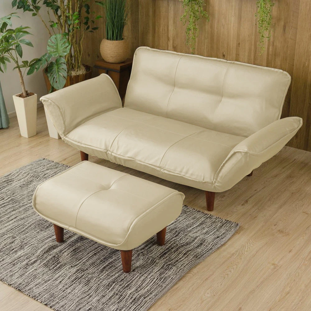 静かに角度を変えて姿勢を整える日本製のレザーソファ PVC アイボリー 2人掛けカウチ(2人掛け+オットマン)