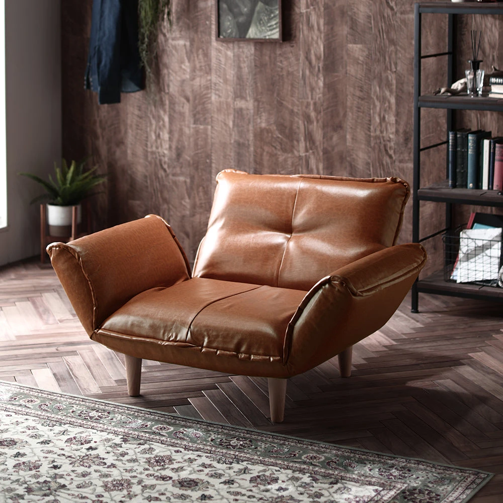静かに角度を変えて姿勢を整える日本製のレザーソファ PVC ヴィンテージキャメル 1人掛け単品