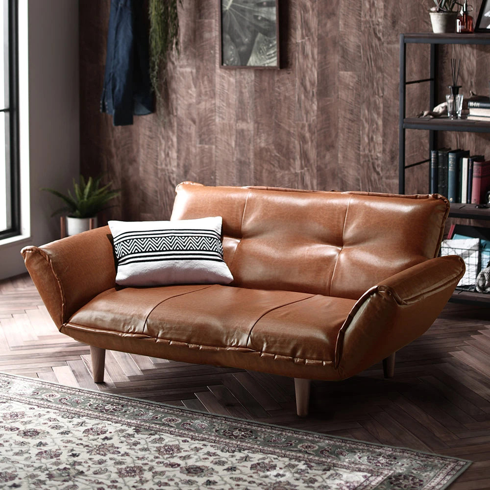 静かに角度を変えて姿勢を整える日本製のレザーソファ PVC ヴィンテージキャメル 2人掛け単品