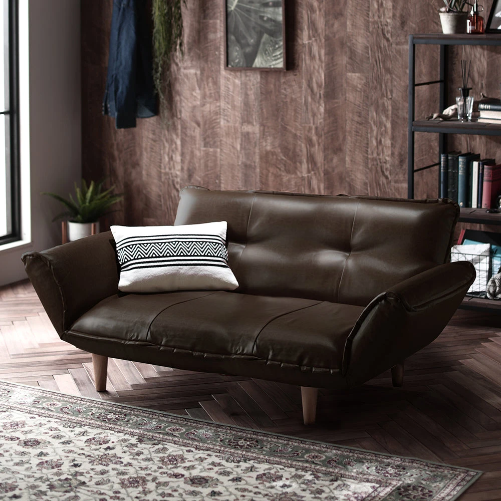 静かに角度を変えて姿勢を整える日本製のレザーソファ PVC ヴィンテージダークブラウン 2人掛け単品