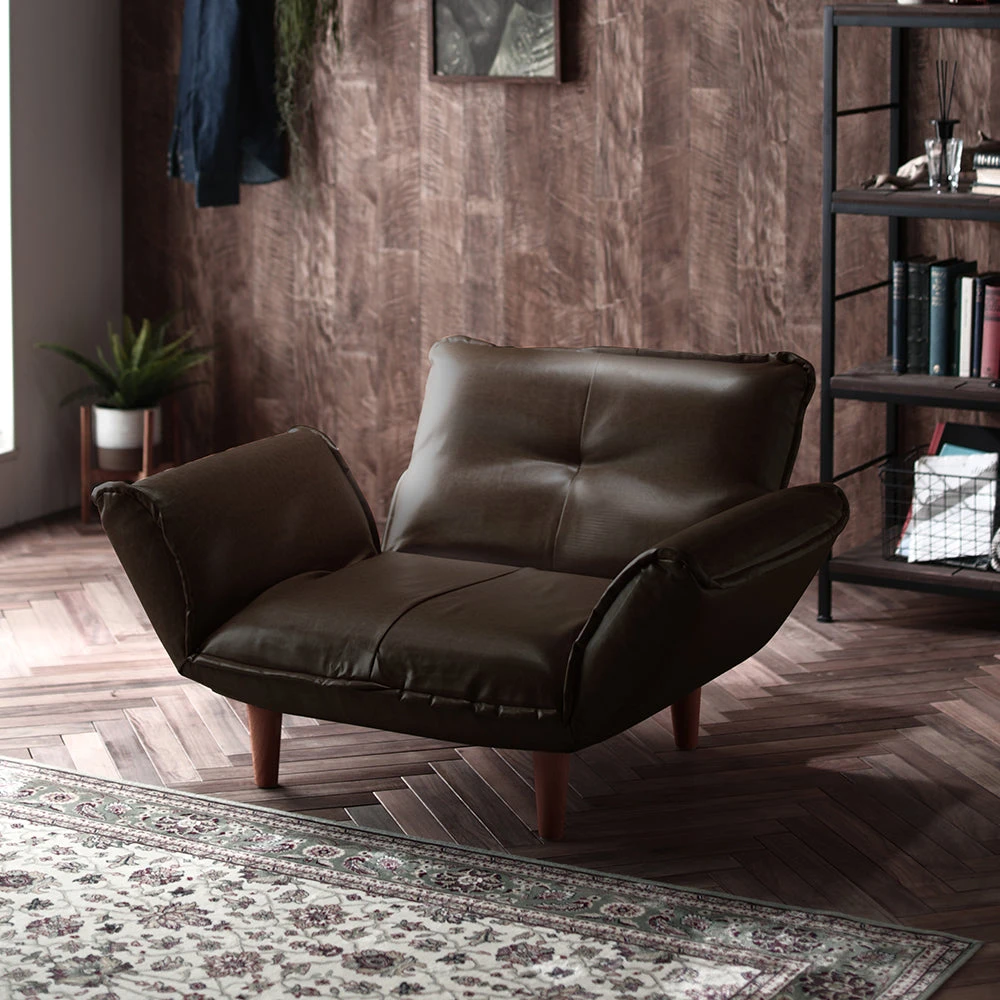 静かに角度を変えて姿勢を整える日本製のレザーソファ PVC ヴィンテージダークブラウン 1人掛け単品