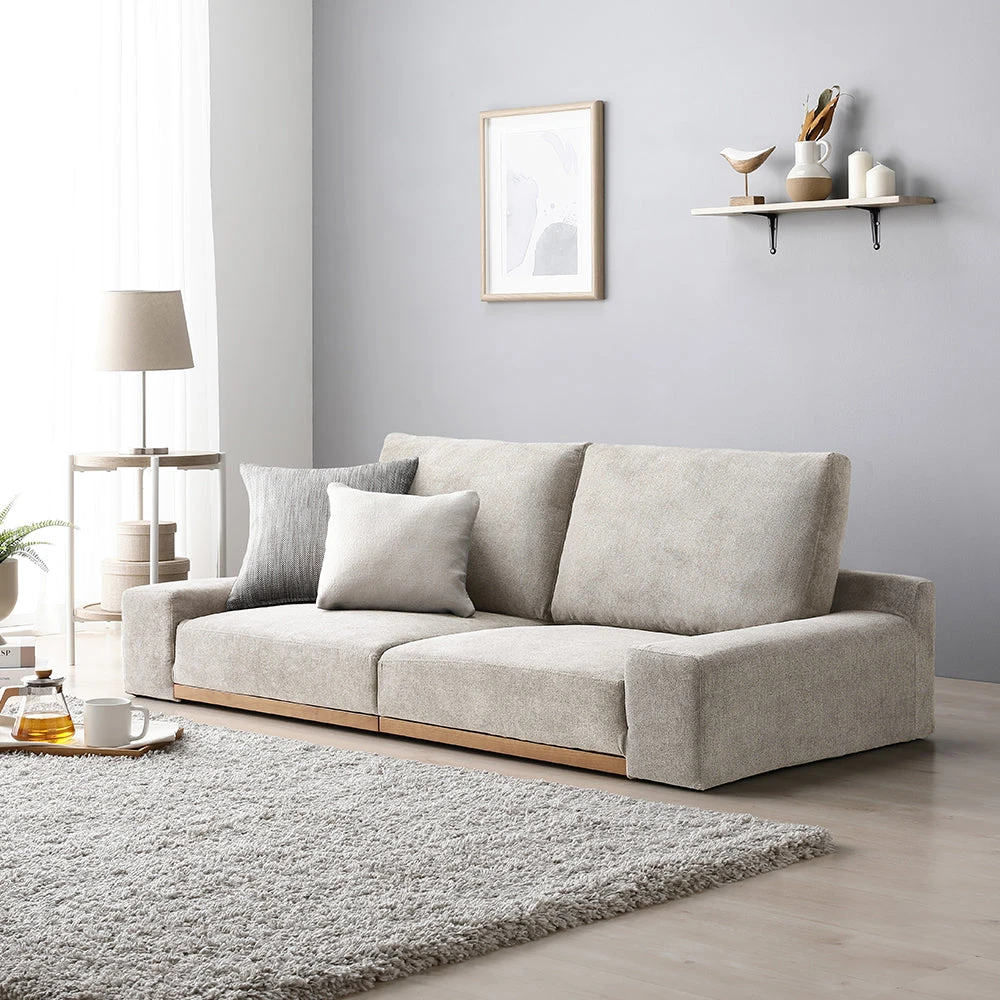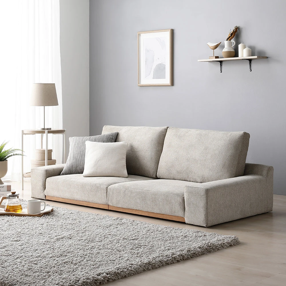 暮らしに合わせて形を変えやすく手入れも簡単、木の質感が引き立つレザーソファ グレージュ 幅160cm