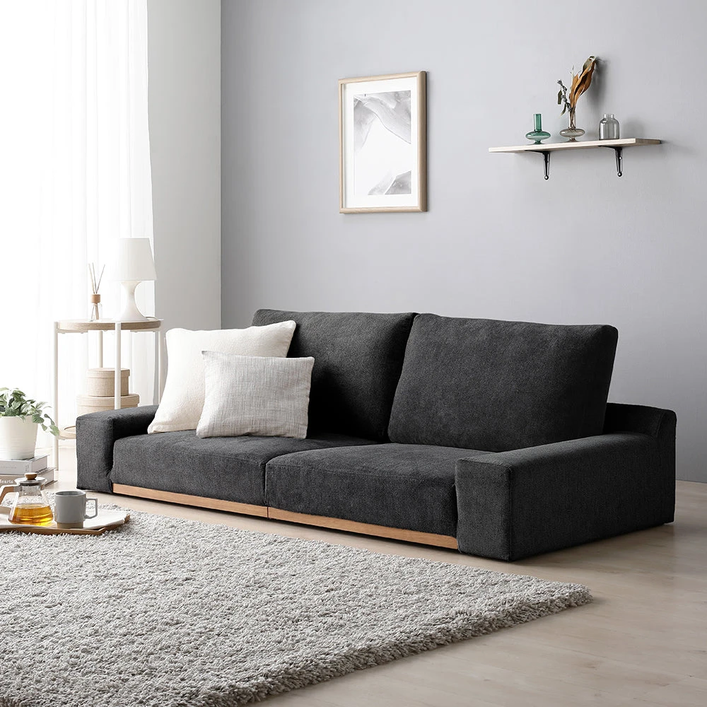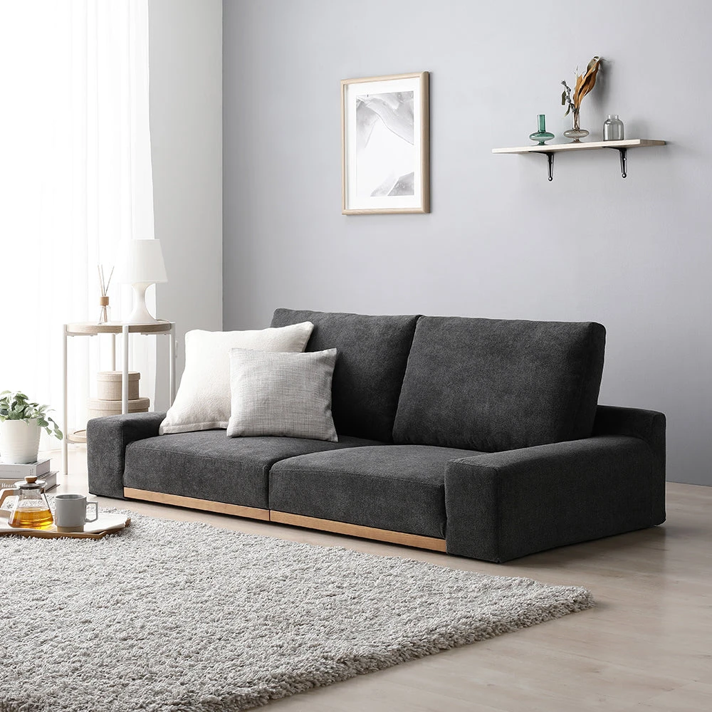 暮らしに合わせて形を変えやすく手入れも簡単、木の質感が引き立つレザーソファ ダークグレー 幅160cm