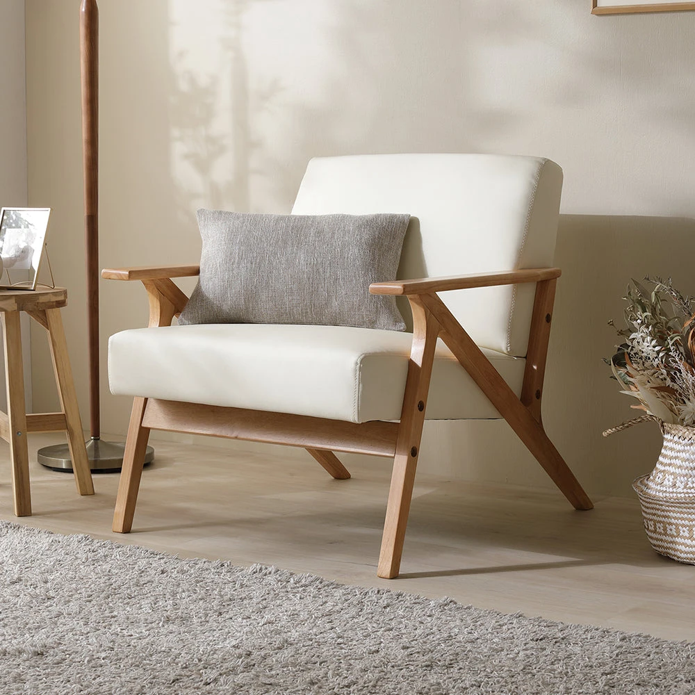 直線的なフレームで空間を引き締める上質なレザーソファ クリームアイボリー 1人掛け